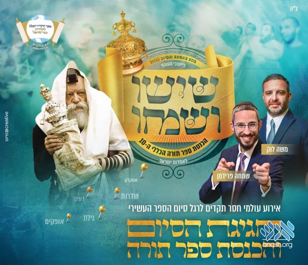 The grand procession of the Torah scroll will take place in the afternoon at “770 House” in Ofakim as a sign of solidarity with the city that has experienced severe trauma, with numerous residents murdered. The writing of the final letters will be held at “770 house”, and at its conclusion, singing and dancing, with Hakafos and Ata Horeisa as customary.