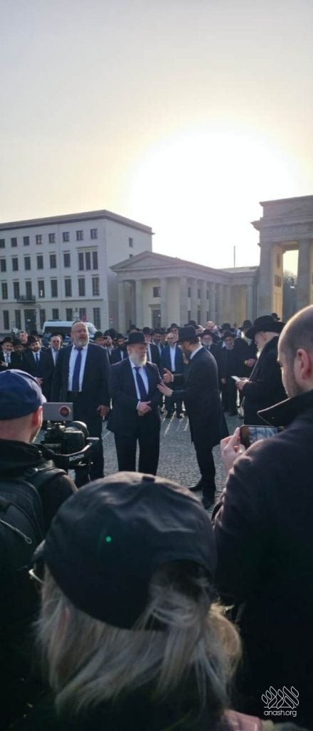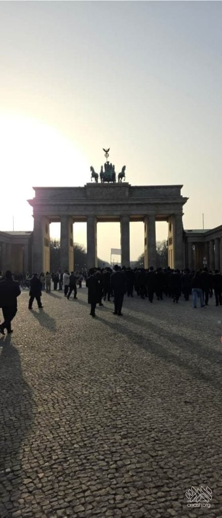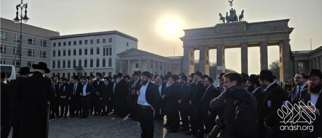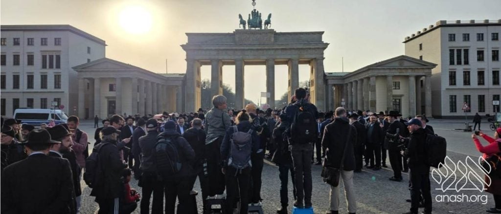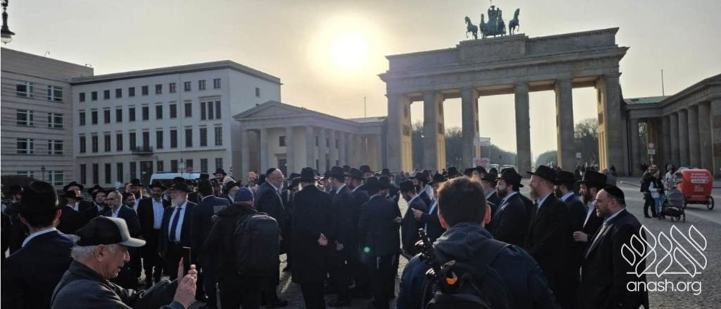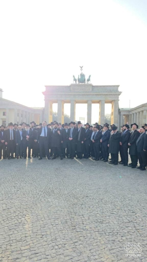 Earlier in the day, the rabbis visited Berlin’s famous Brandenburg Gate, where they posed for a group photo as media cameras and television crews captured the moment. They sang “Ani Maamin” and “Oseh Shalom” before breaking out into a spirited dance to the Rosh Chodesh Kislev niggun.