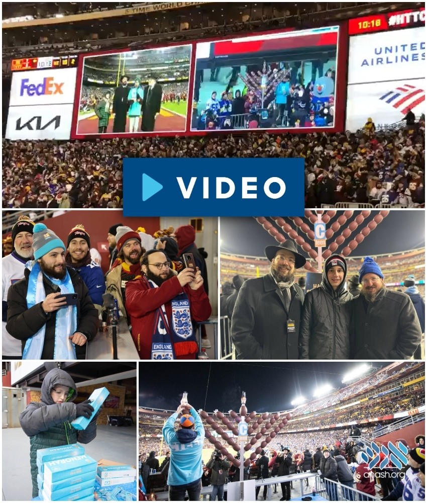 In the game’s second quarter, the announcer invited the crowd to turn their attention to the screens as a Jewish teen recited the blessings and lit a specially designed Football menorah on the concourse overlooking the football field. The crowd erupted in cheers and fireworks filled the sky as the first candle was lit. Rabbi Shimon Rivkin of CTeen International, Rabbi Shmuel Kaplan, and Rabbi Sholom Raichik of Chabad, Maryland, were present and wished the fans a happy Chanukah.