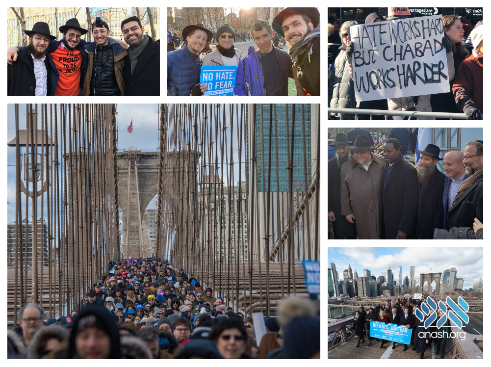 Thousands marched across the Brooklyn Bridge in a march to show solidarity with the victims of recent anti-Semitic attacks. Chabad Mitzvah Tanks showed up and helped hundreds put on tefillin.