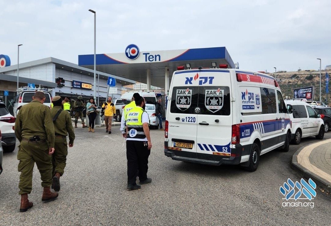 MDA paramedic Tomer Fein and MDA EMT Anatoly Firer said: “Next to the pumps at the gas station were 2 wounded people who suffered from stab wounds. A 35-year-old man was unconscious, without a pulse and not breathing, and after medical examinations an MDA paramedic pronounced him dead. The second victim, a man of about 40 years old, was unconscious, we gave him life-saving medical treatment that included giving him drugs and plasma in order to stabilize his condition and evacuated him to the hospital in serious condition where he was sedated and ventilated.”