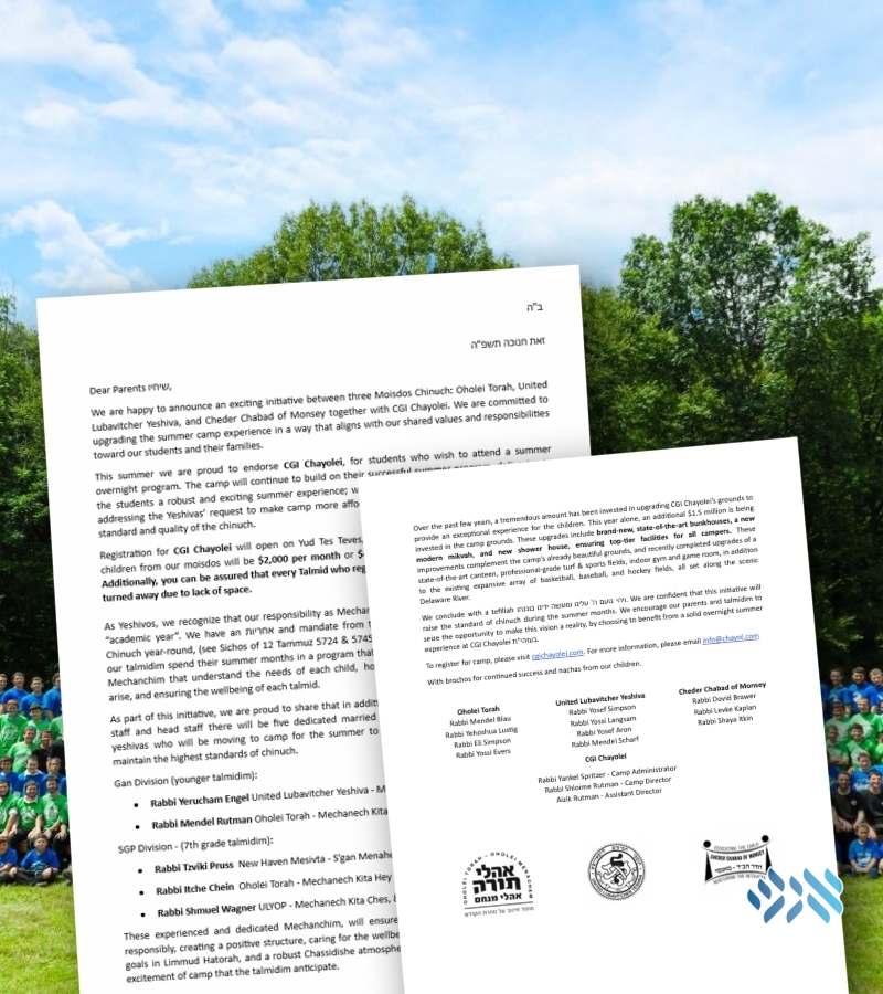 We are happy to announce an exciting initiative between three Moisdos Chinuch: Oholei Torah, United Lubavitcher Yeshiva, and Cheder Chabad of Monsey together with CGI Chayolei. We are committed to upgrading the summer camp experience in a way that aligns with our shared values and responsibilities toward our students and their families.