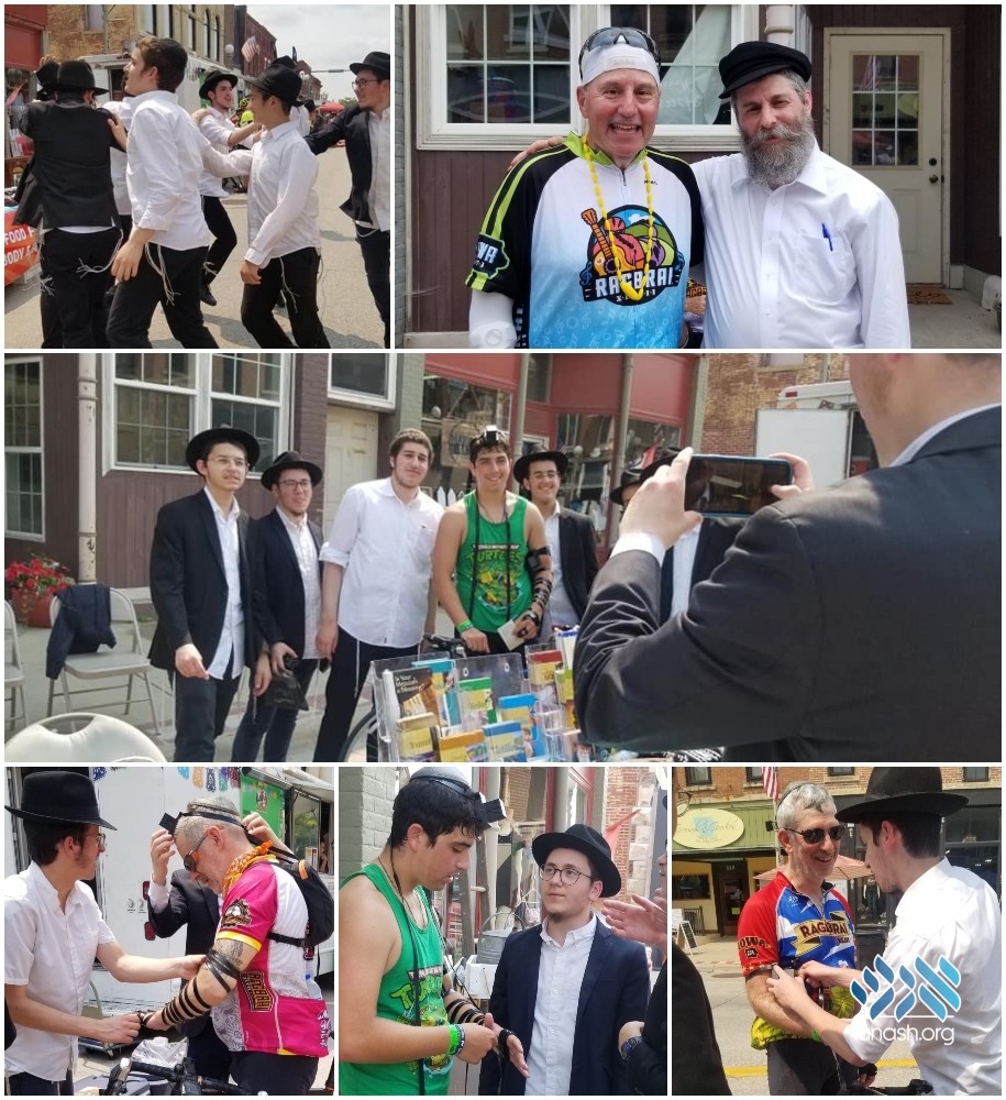 Bikers who were taking part in a seven-day bike ride across the state of Iowa were welcomed by a Chabad N.E. Iowa tefillin booth, manned by bochurim from the Postville yeshiva.