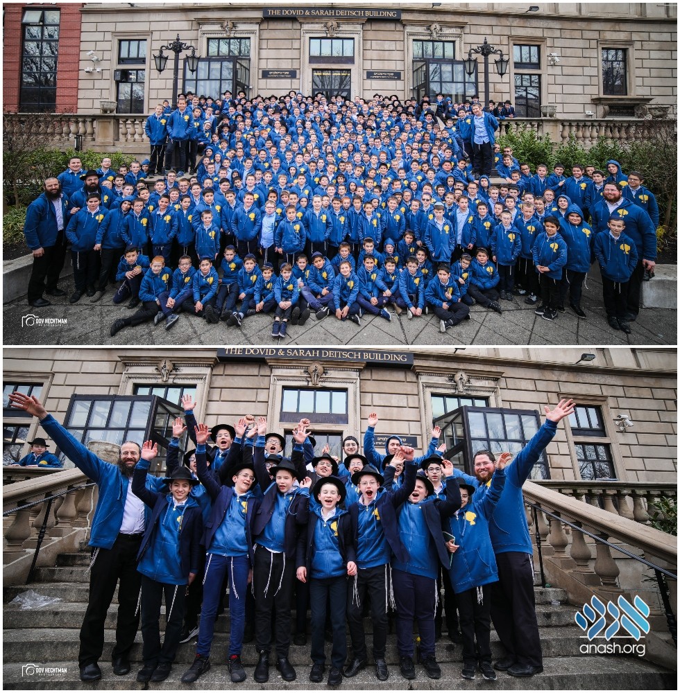 Nearly 400 boys from Oholei Torah who passed all the tests to join the International Chidon, posed for a group photo outside their school building on Thursday afternoon.