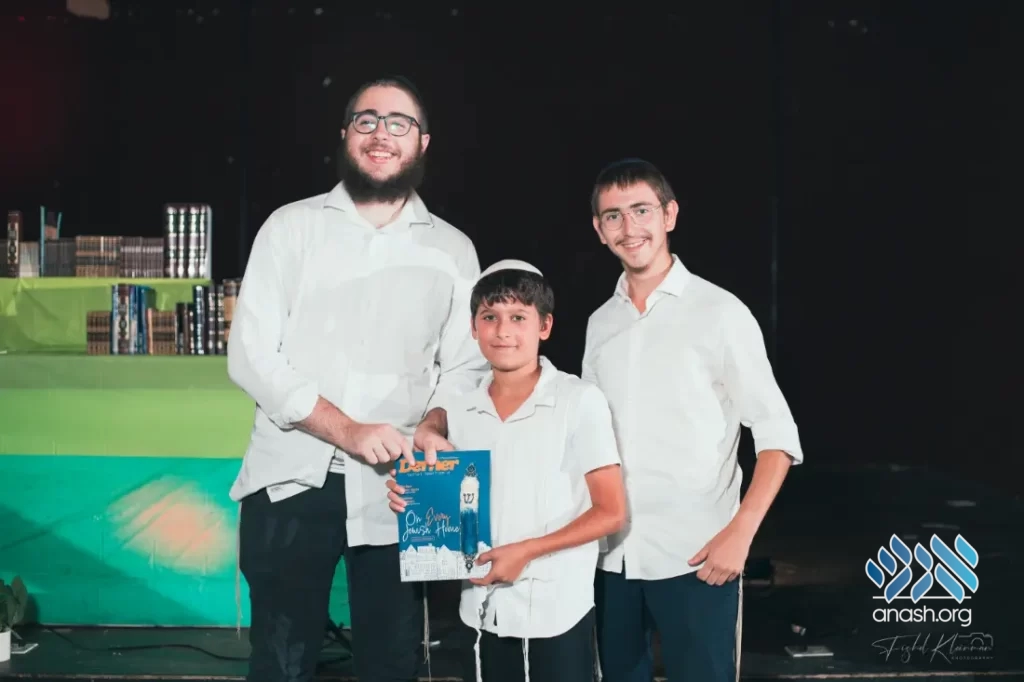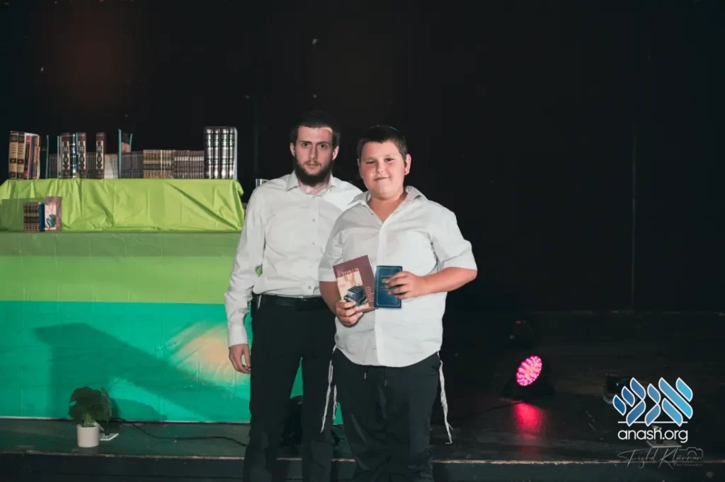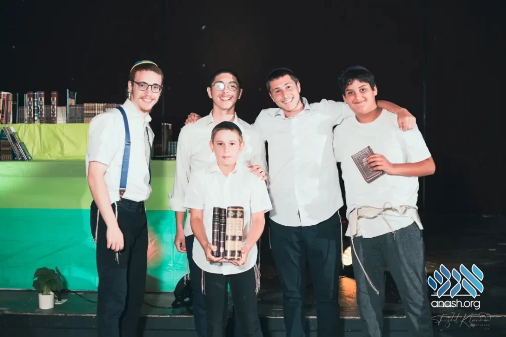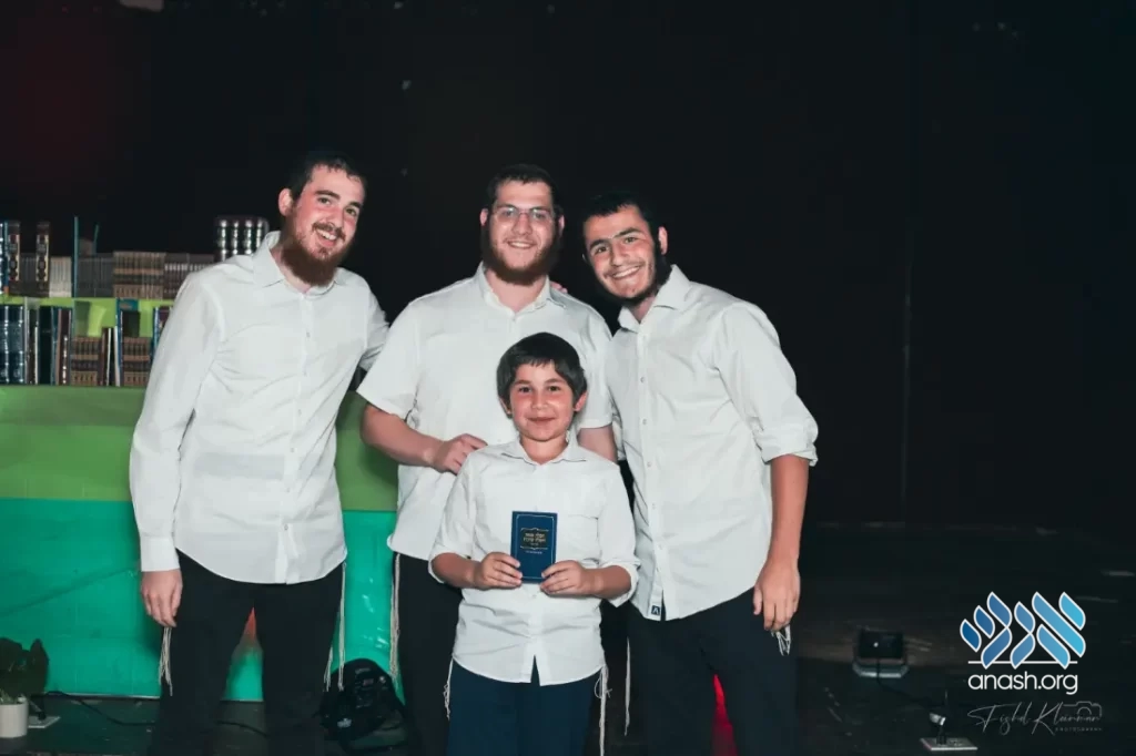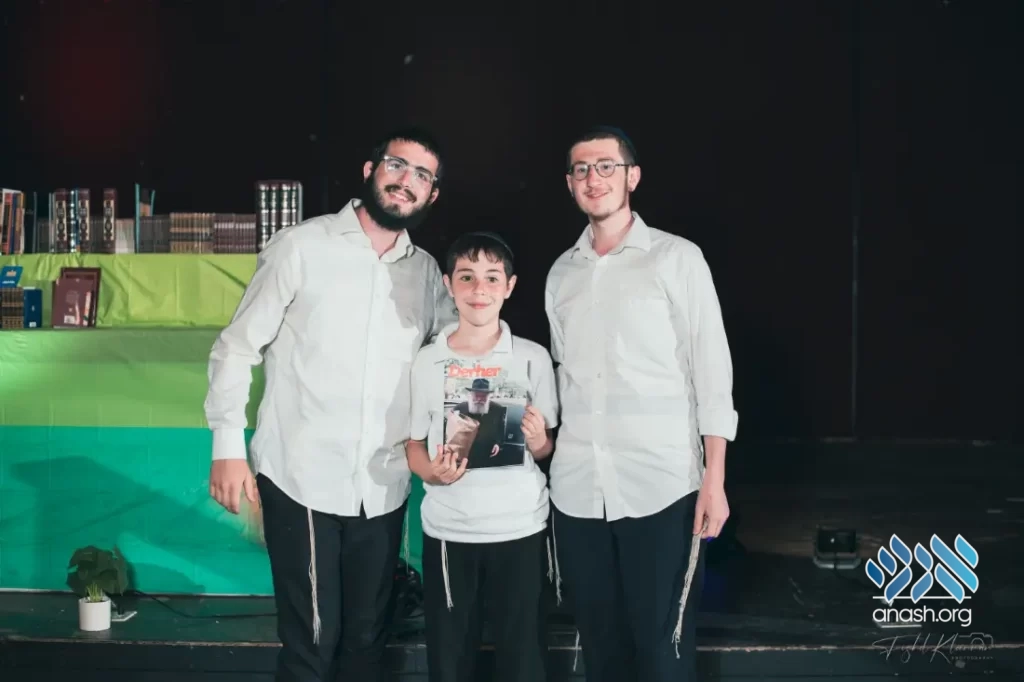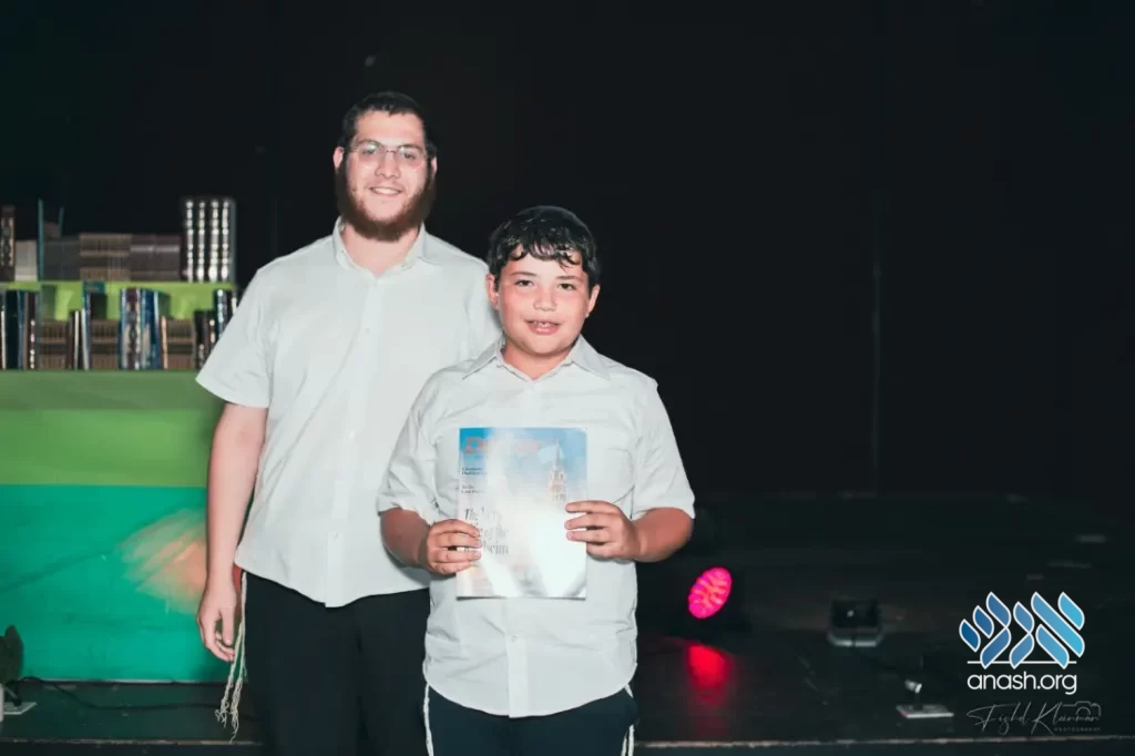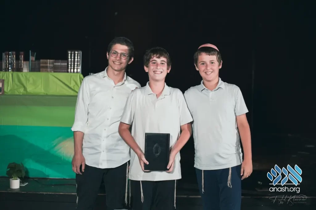 A video showing the Rebbe’s appreciation for such gifts was shown, followed by honoring the campers present in camp with the most points: 1st Place – Rafi Schrage, 2nd Place – Ari Katan, and 3rd Place – Eli Cattan.