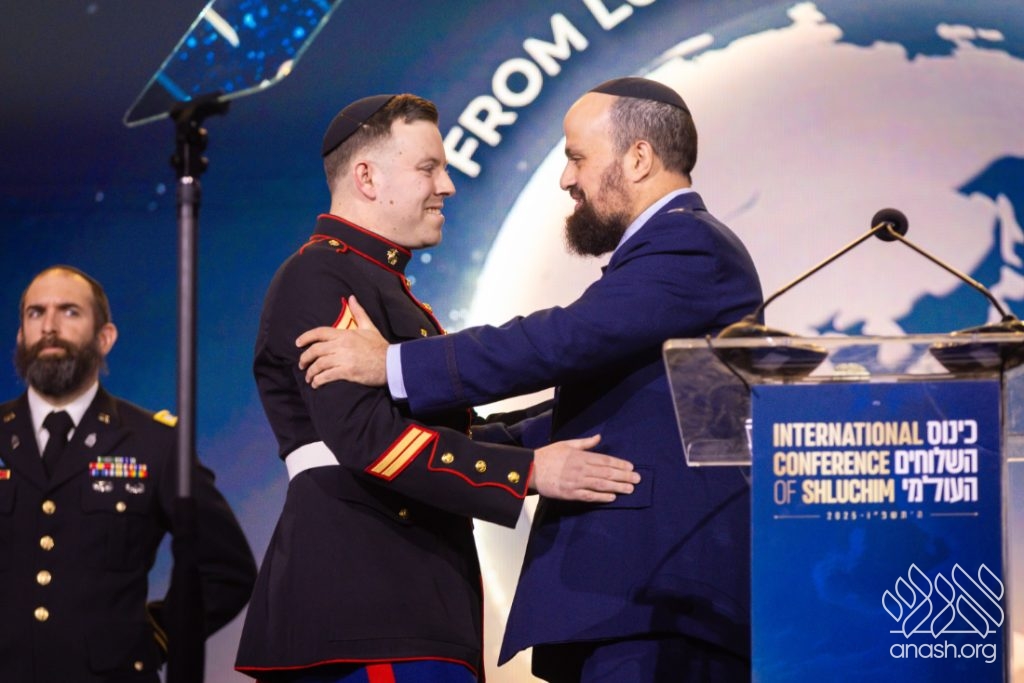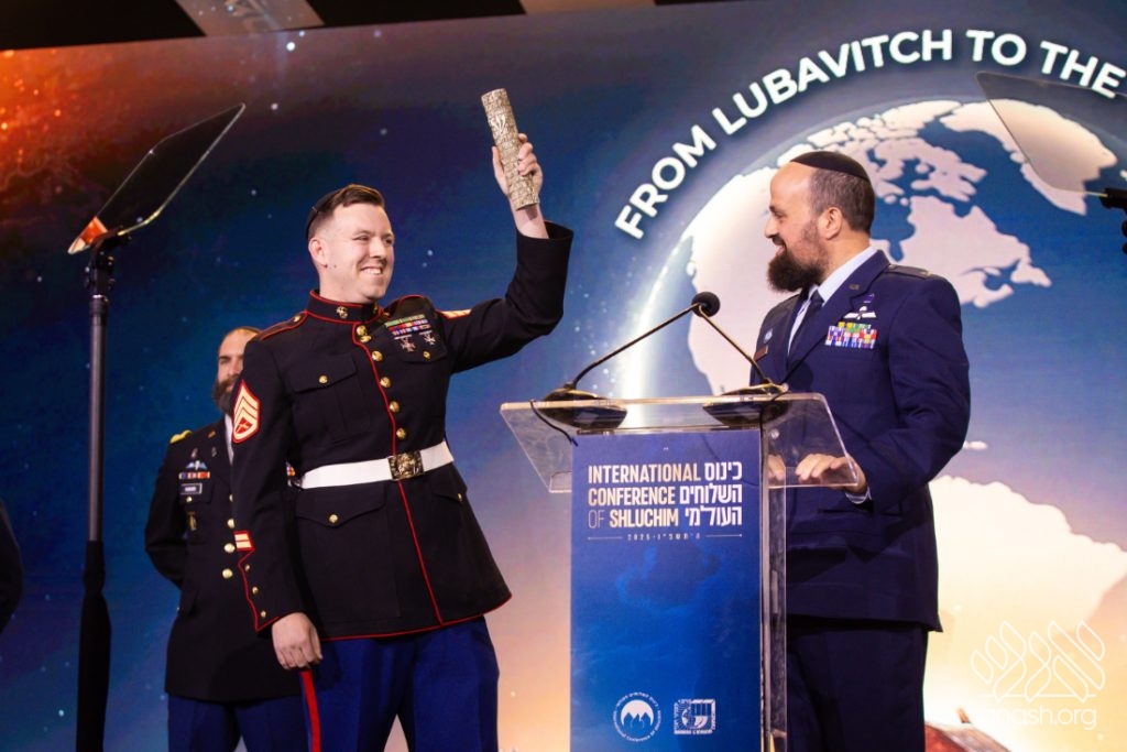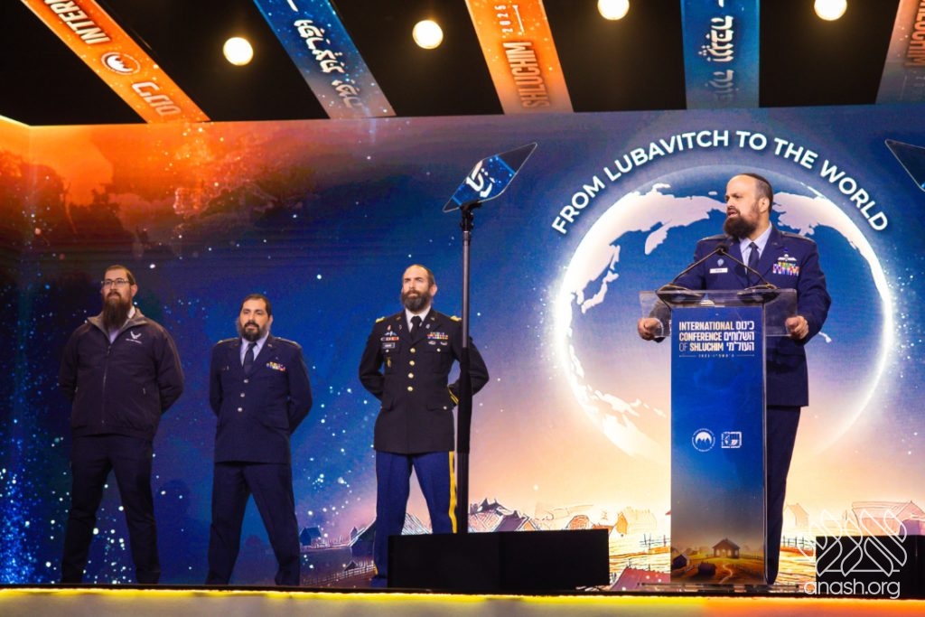 “In the Air Force, we say, service before self,” said Pekar from the podium. “Today, we reflect on the Rebbe’s deep concern for those who served in uniform. He understood that … nothing stands in his way until the mission is accomplished—just like a shliach!” With Chabad emissary-chaplains representing all branches of the armed forces on stage, Pekar presented Craig with a mezuzah for the Jewish home he is establishing with his soon-to-be wife.