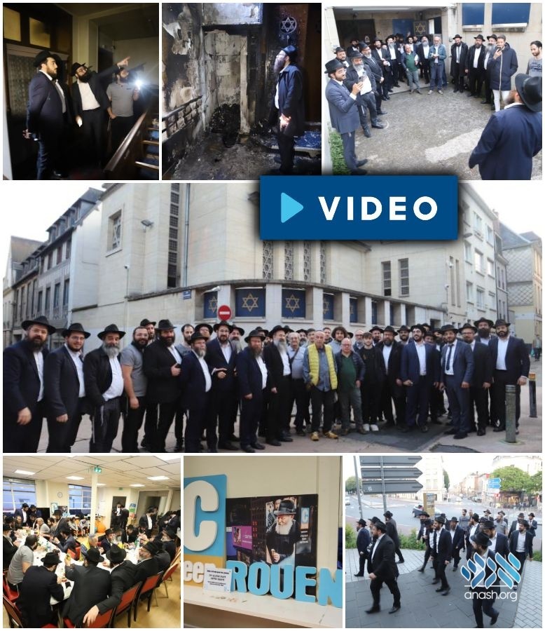 Following the arson attack by an Arab terrorist, a delegation of 70 shluchim from Paris and its suburbs visited the Rouen shul to support the Jewish community and its shliach Rabbi Shmuel Lubecki.