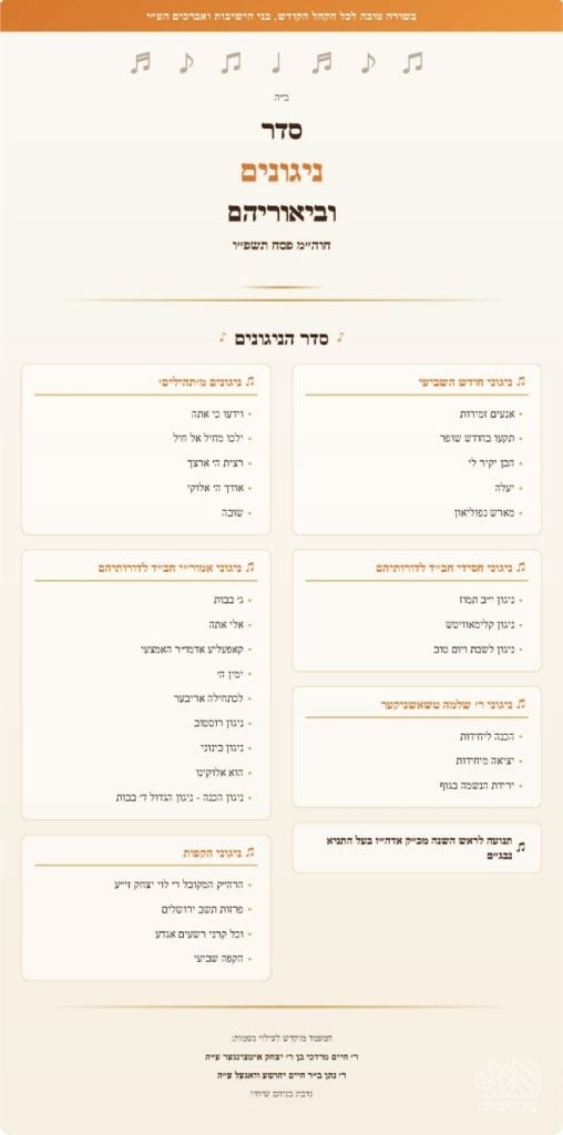 Among the chosen niggunim were the Yechidus Niggun of Reb Shlomo Tshashinker, Niggun Klimovitch, the Alter Rebbe’s Likras Shabbos and Shema Yisroel, along with other beloved Chassidishe melodies.