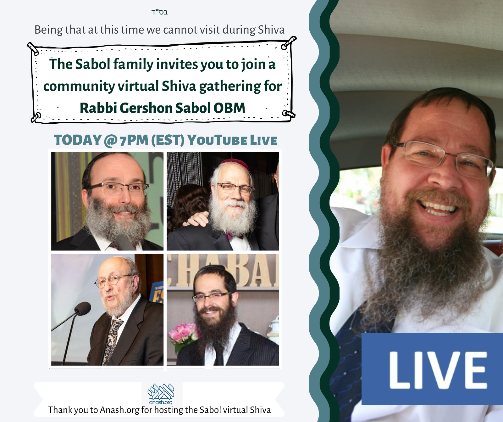 Join Live at 7:00 pm: Coronavirus prevents in-person shiva visits. An online communal shiva will celebrate Rabbi Gershon Sabol’s life, with speakers Rabbis Aryeh Sufrin, Baruch Rabinowitz, Sholom Ber Hecht, Yisroel Wilhelm and Shea Hecht.