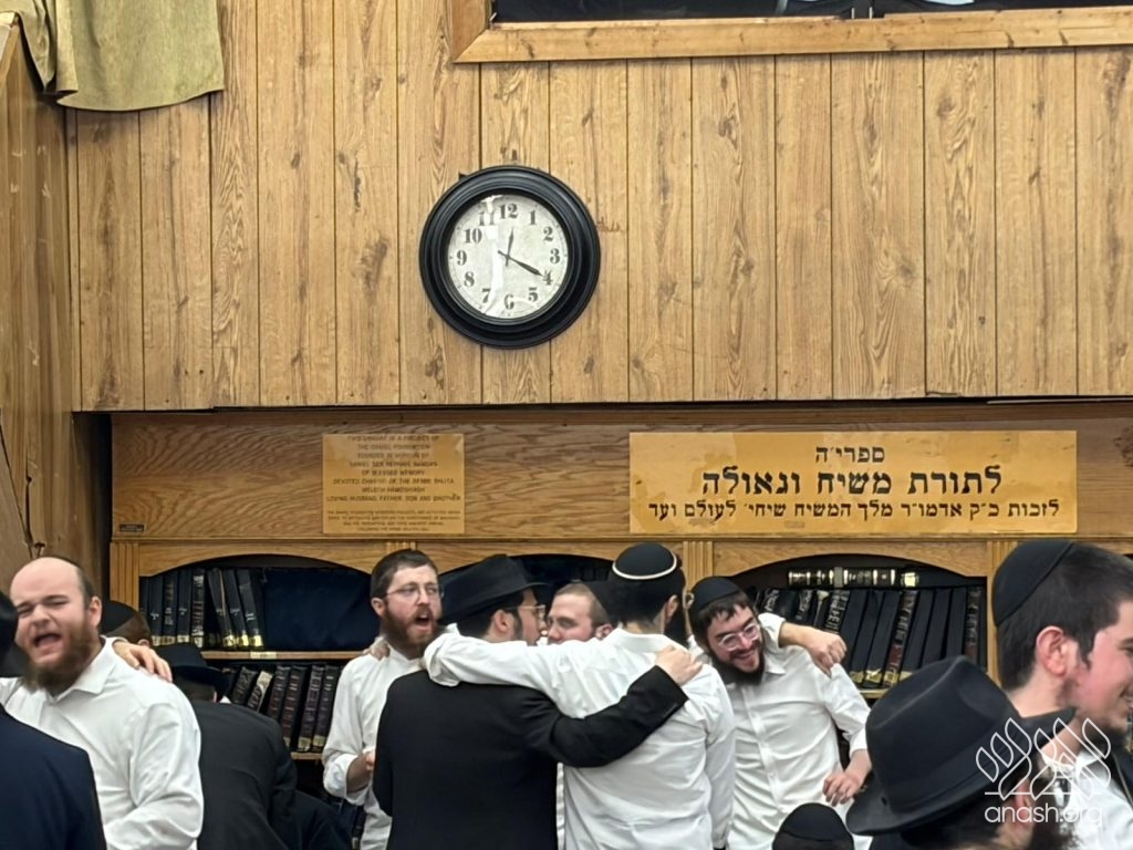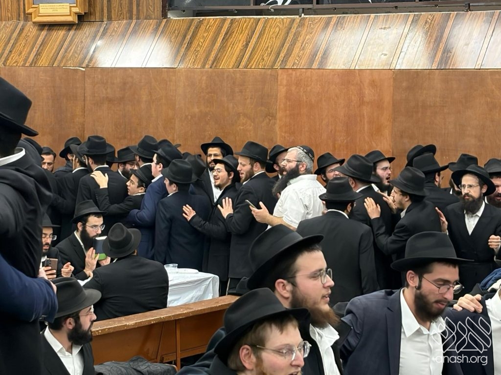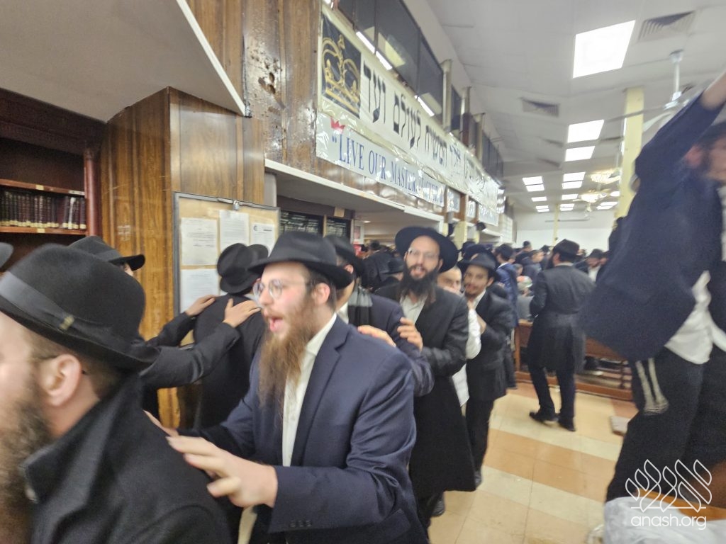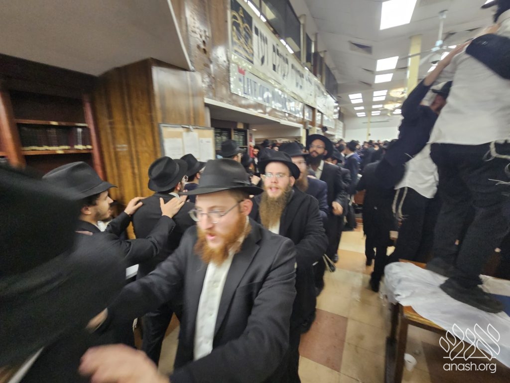 Following the farbrengen the crowd then broke out into joyous dancing celebrating the yom tov of Rosh Chodesh Kislev, the day the Rebbe left 770 for the first time after suffering a heart attack on Shmini Atzeres.