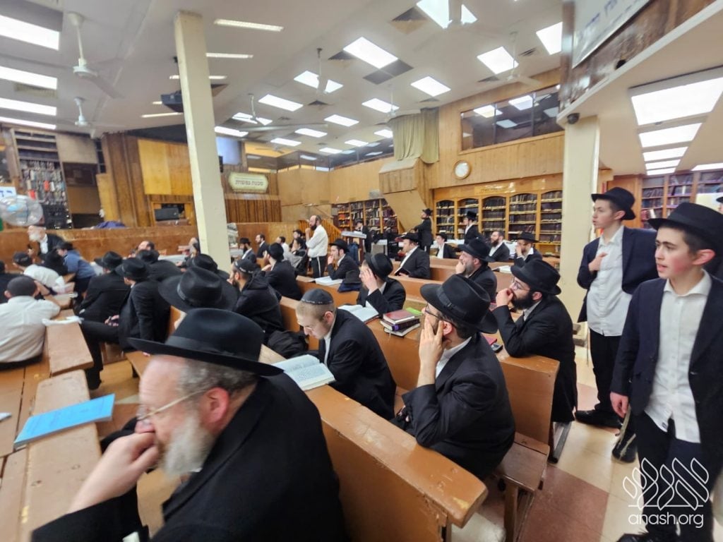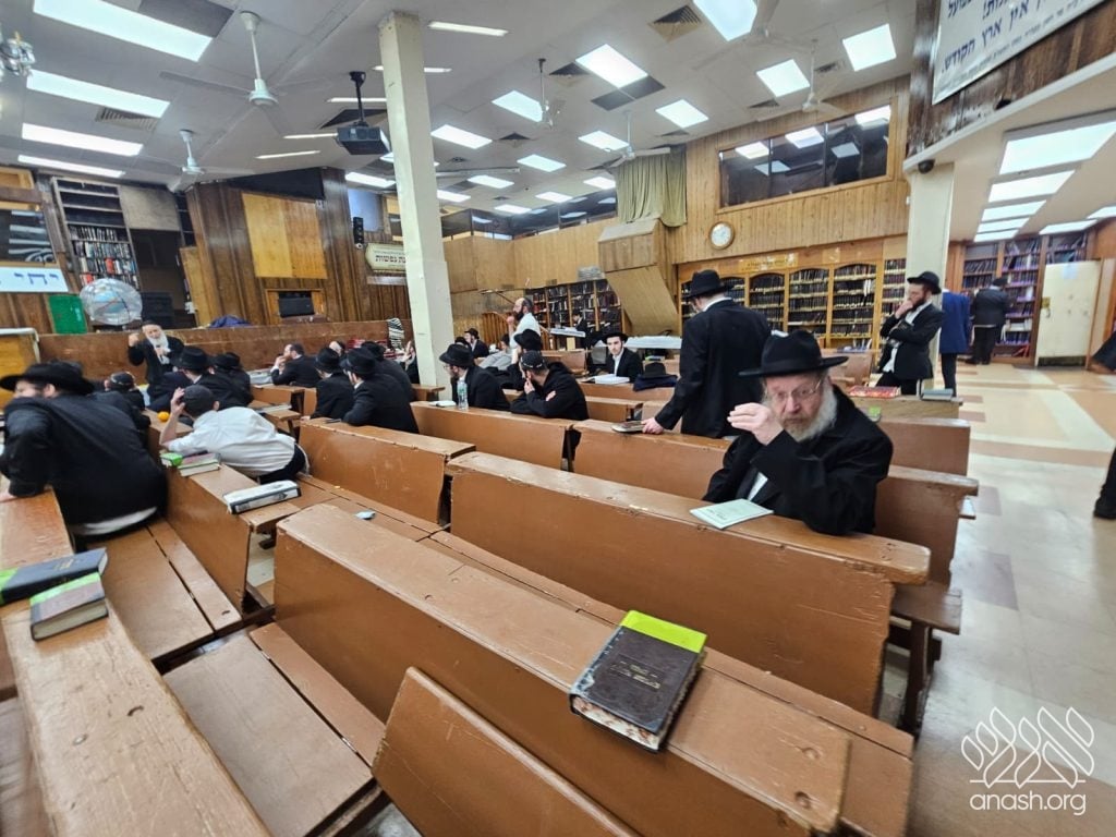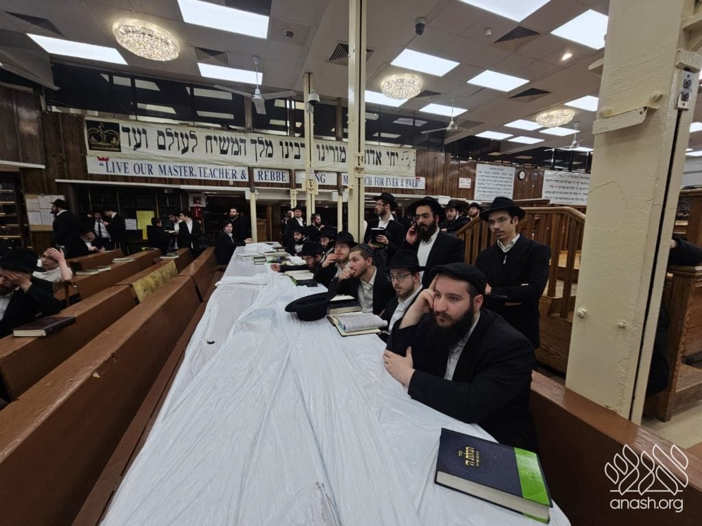 Anash and Bochurim packed the main shul of 770 on Sunday, the second day of Chol Hamoed, to learn the complex laws of Kiddush Hachodesh of the Rambam, which are being learned over the coming days.