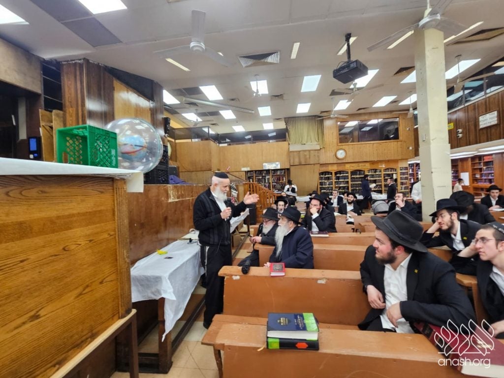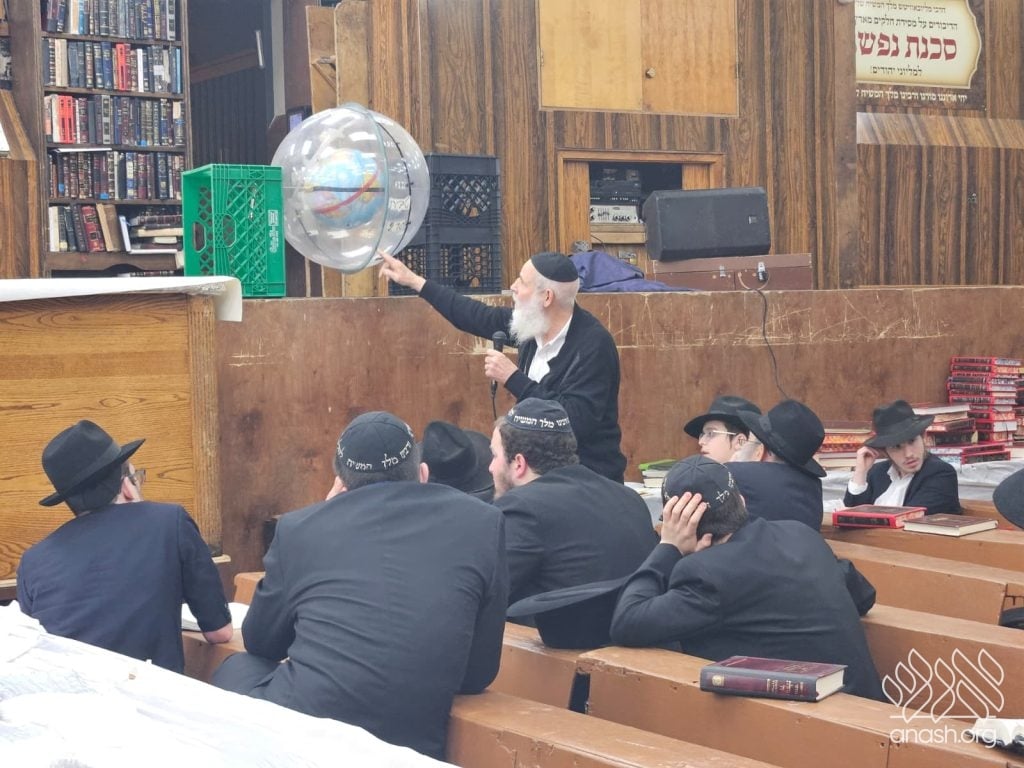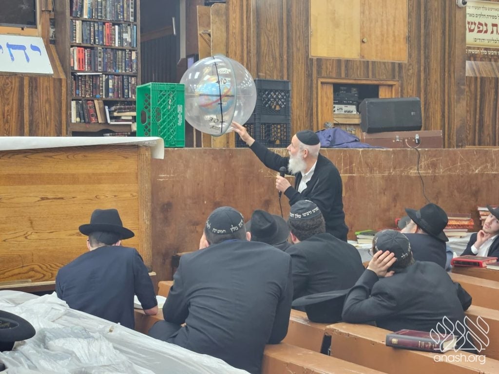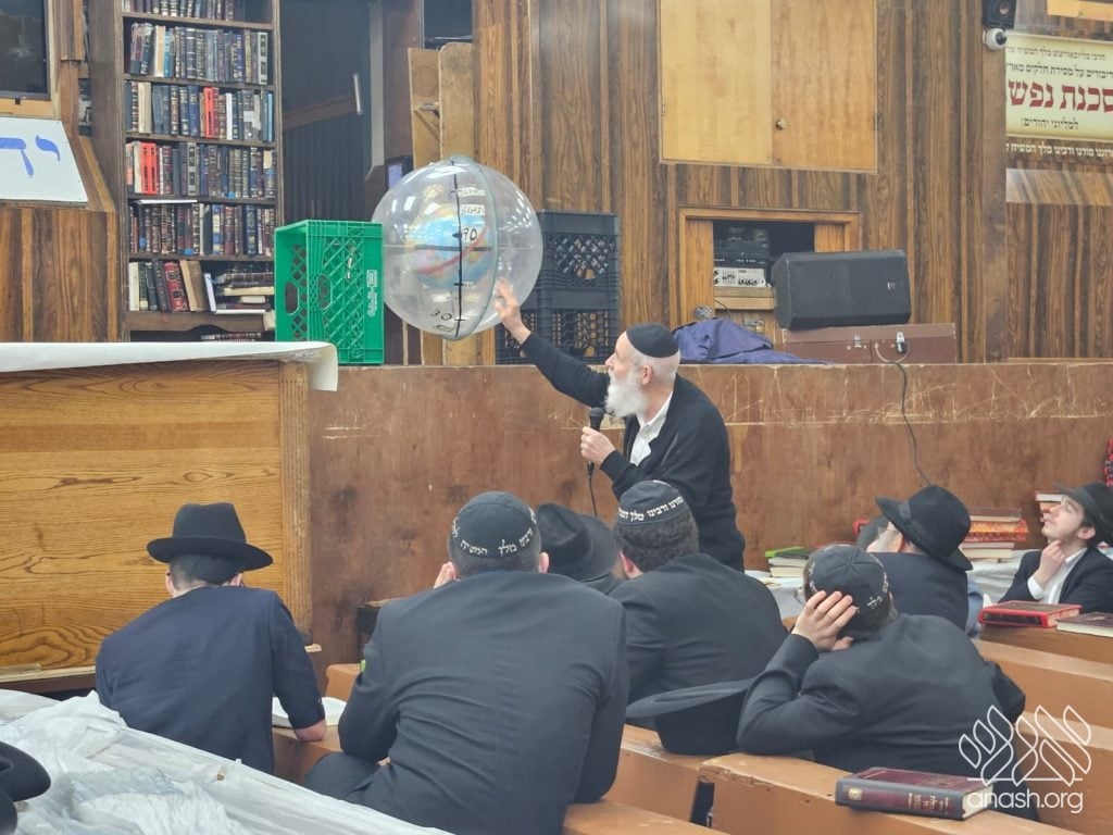 The presentation was given by 770 gabbai and renowned Kiddush Hachodesh teacher Rabbi Yosef Losh, who demonstrated these difficult concepts using a globe and props.