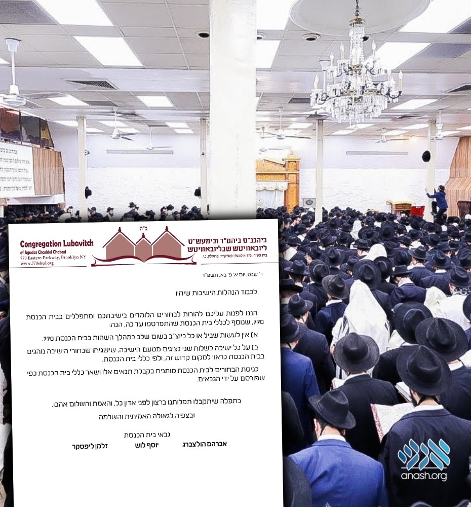 The gabboim of the main shul at 770 published a letter forbidding on bochurim to make any sort of “shvil” and laying down rules for bochurim who daven in 770.