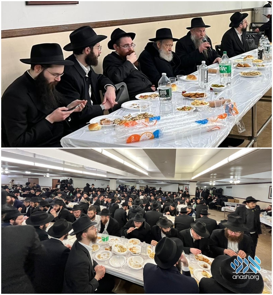 The mashpi’im and magidei shiurim of the Central Tomchei Tmimim at 770 Eastern Parkway gathered on Tuesday, Yud Tes Kislev, for a seudah and farbrengen with the entire student body of the 770 yeshiva.