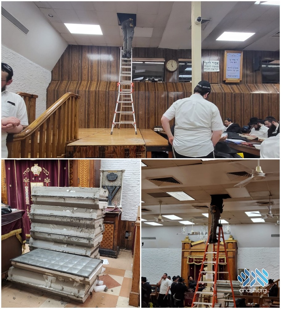 Over the past few days, workers have been hard at work in the main shul at 770 Eastern Parkway, replacing all the ceiling lights with new LED fixtures, coming on the heels of a weeks long upgrade of the shul ahead of Pesach.