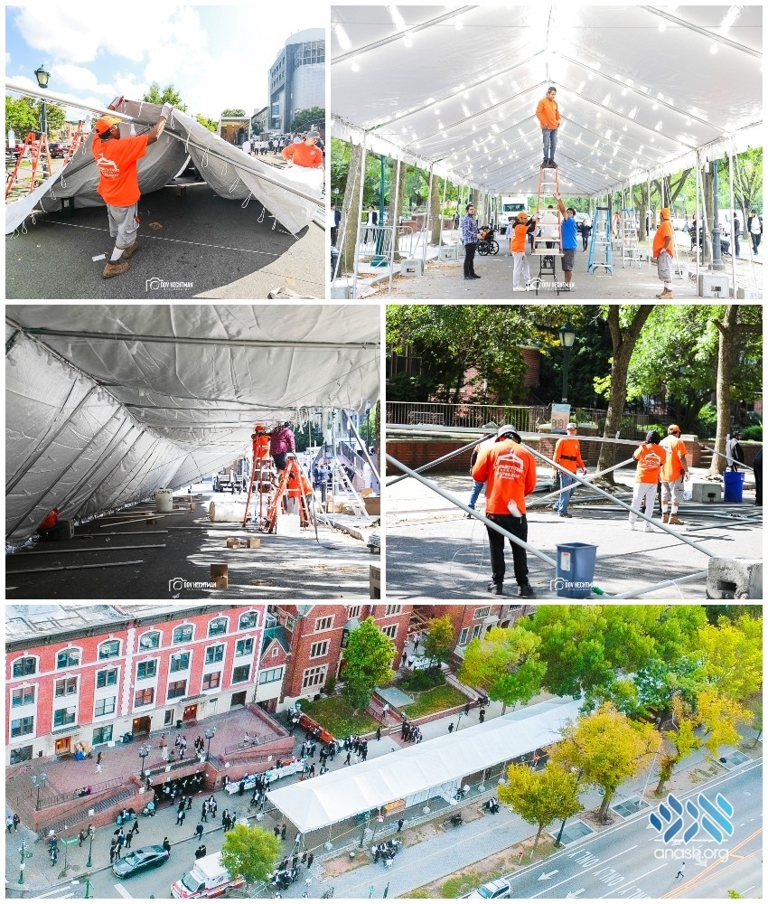 The fully air-conditioned tent was constructed in the Eastern Parkway service lane outside 770, and serves as an expansion for the overflow crowd during Tishrei.