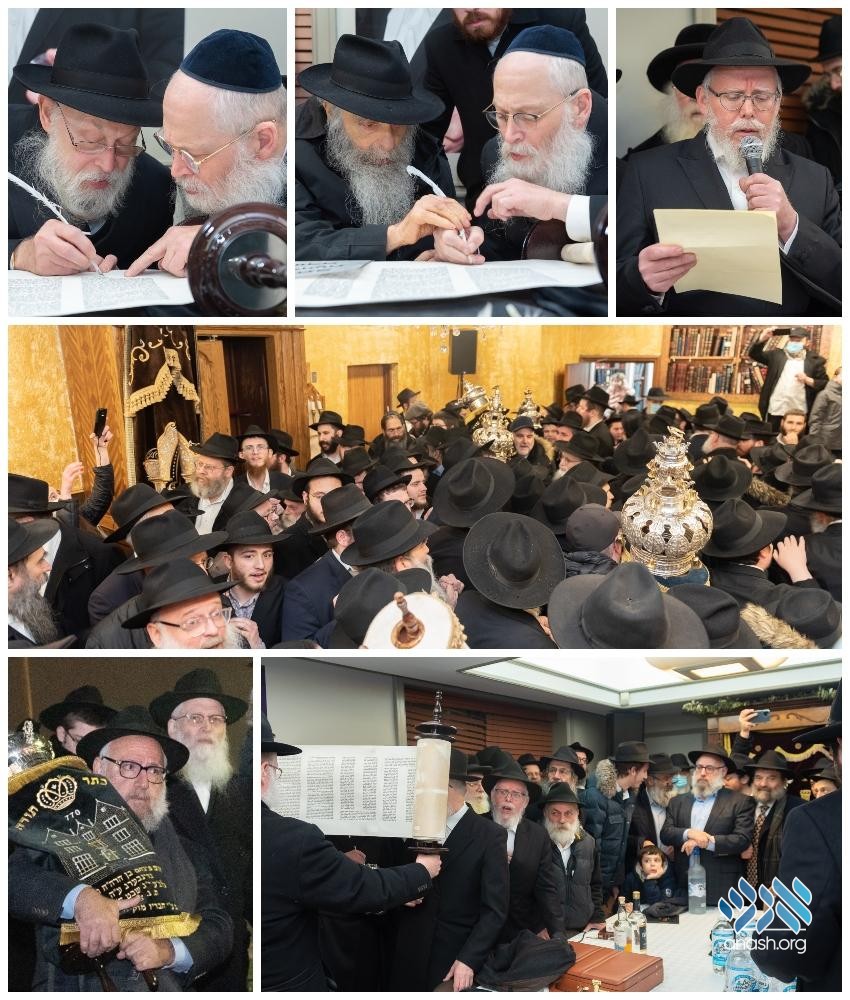 The final letters in the Sefer Torah were written in the Conference Room at 788 Eastern Parkway, followed by tahalucha and hakafos in the zal at upstairs 770 Eastern Parkway.