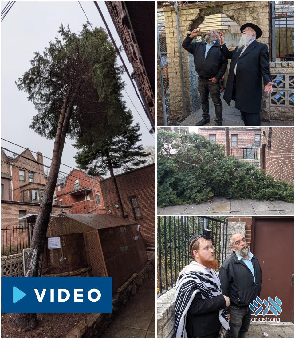 The two trees on the sides of 770’s iconic ‘Tashlich’, which were in danger of falling after being damaged by storms last week, were removed on Monday by R’ Yossi Rabkin.