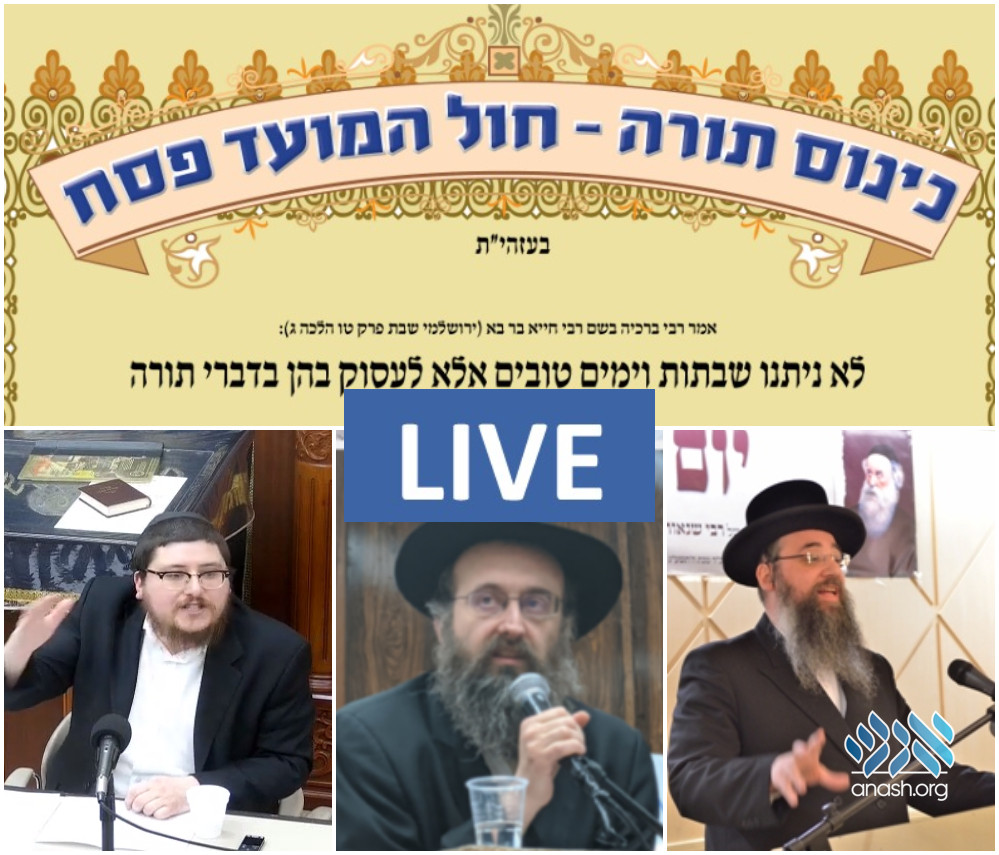Join Live at 8:30 pm: An online Kinus Torah with Harav Yosef Braun of Crown Heights, Harav Gedalya Oberlander of Monsey and Rabbi Moshe Eliyahu Gourarie of Pomona.