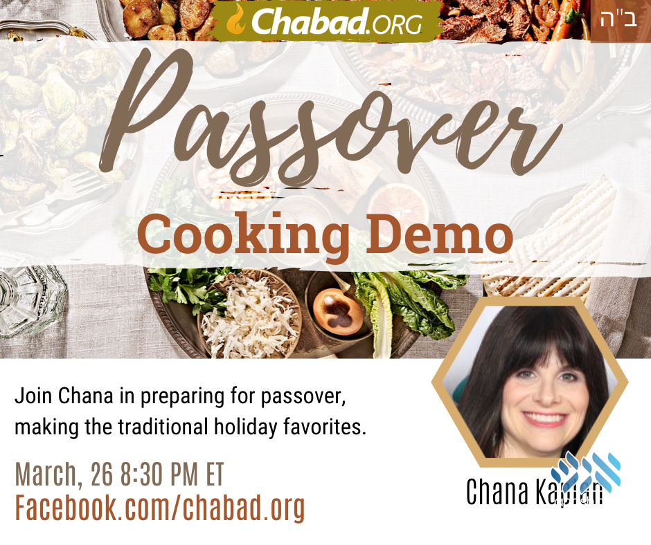 Join Live at 8:30 pm EST: A live cooking demo by Mrs. Chana Kaplan who will show how to make the traditional Pesach foods.