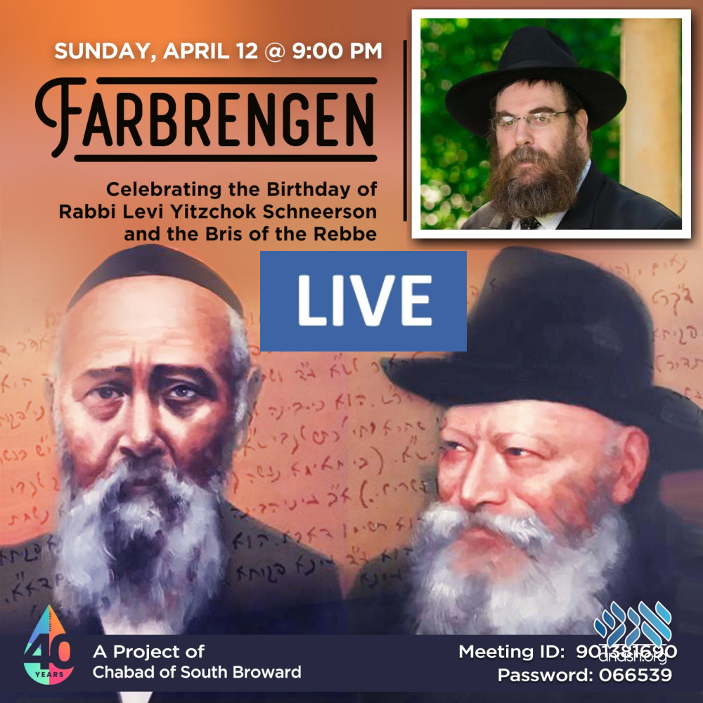 Join Live at 9:00 PM: A virtual Farbrengen will mark the birthday of Harav Levi Yitzchak Schneerson and the day of the Rebbe‘s Bris, with Rabbi Dovid Dubov, shliach to Princeton, NJ, and author of seforim explaining Reb Levi Yitzchak’s Torah.
