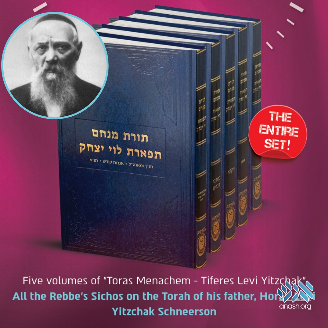 In recent days, as we mark Horav Levi Yitzchok and Rebbetzin Chana’s 120th wedding anniversary, the full set of Toras Menachem — Tiferes Levi Yitzchak has appeared for the very first time, spanning the entire Torah, Tanach, Shas, Zohar and Tanya. In honor of the new printing, the Seforim are available on a one-time basis for a fraction of the regular cost (just $30) on lahak.org/sale or by telephone from Kehos in Kfar Chabad at 03.9606.018.