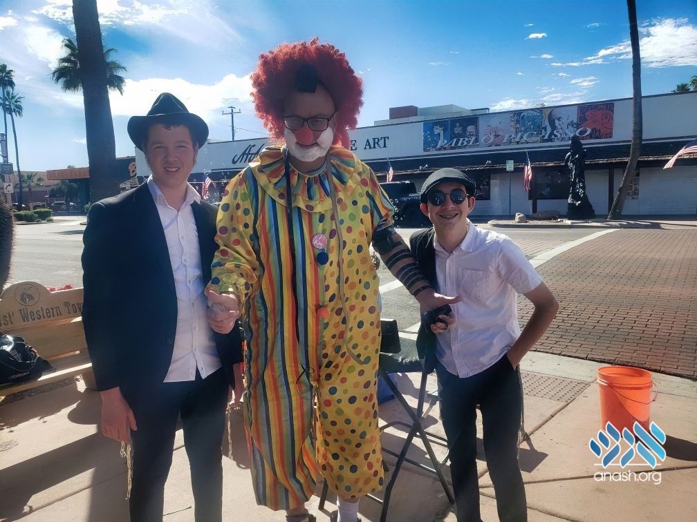 On Purim Katan day, bochurim Shneur Weiss and Mendel Wilansky of the Arizona Mesivta met a clown on mivtzoim. They found out that he was Jewish and put on Tefillin with him for the first time.