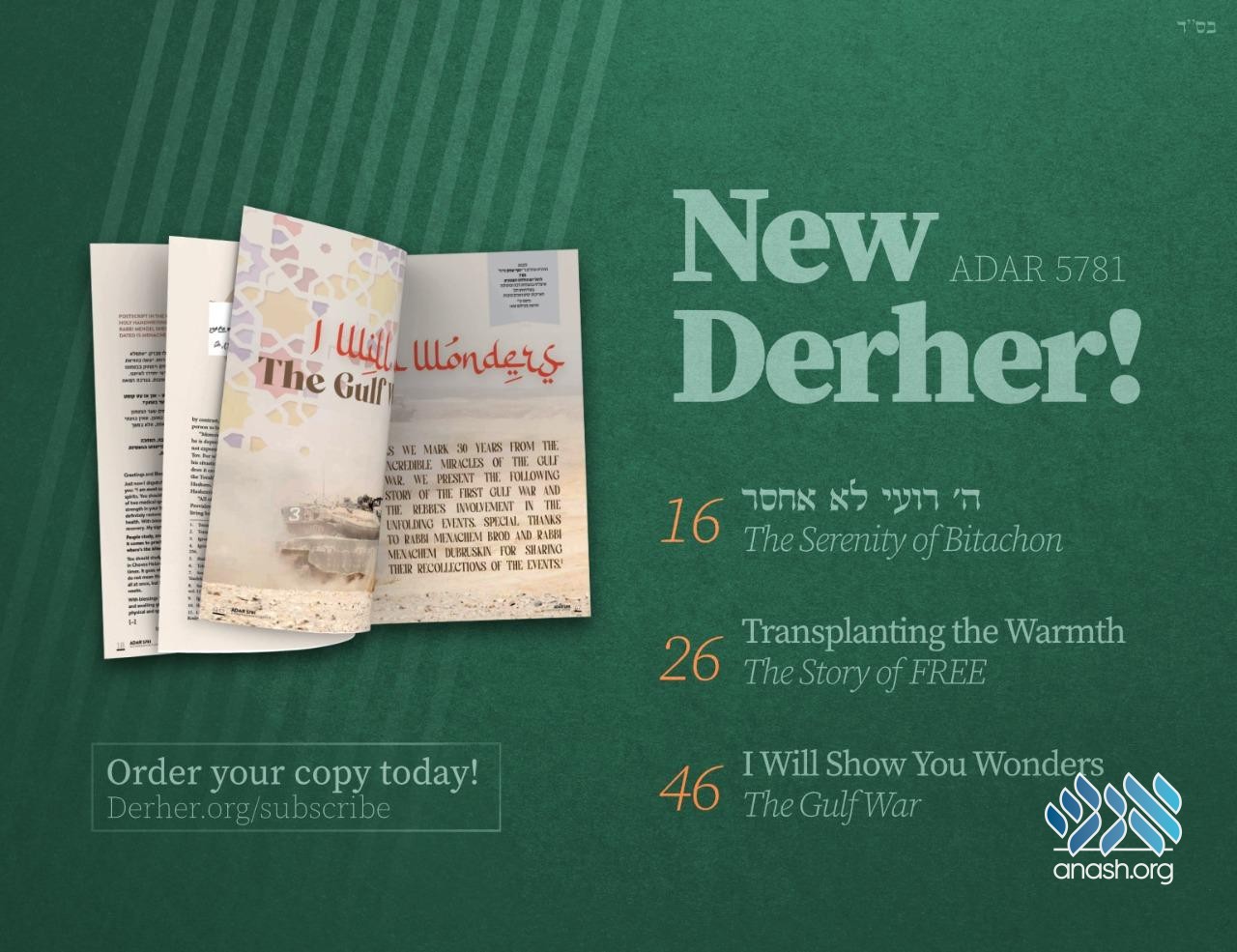 This month’s Derher is packed to the brim with gripping Chassidishe content, at the center of which is an extensive article about Bitachon, an article tracing the story of F.R.E.E., and all the regular columns.