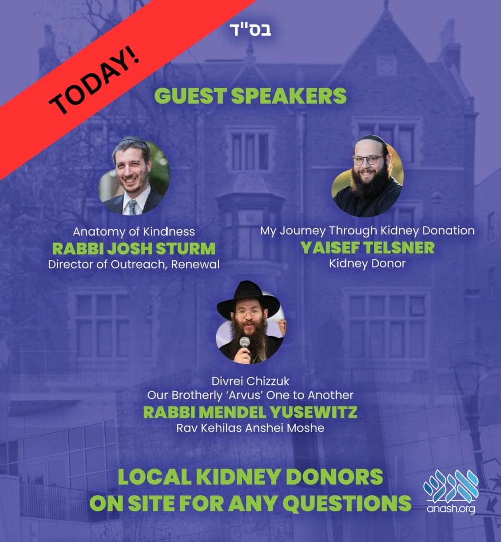 The highlight of the evening will be a program beginning at 7:00 PM, featuring words of inspiration and chizzuk, including Rabbi Josh Sturm, Director of Outreach at Renewal, and Yaisef Telsner, a Lubavitcher kidney donor sharing his personal journey.
