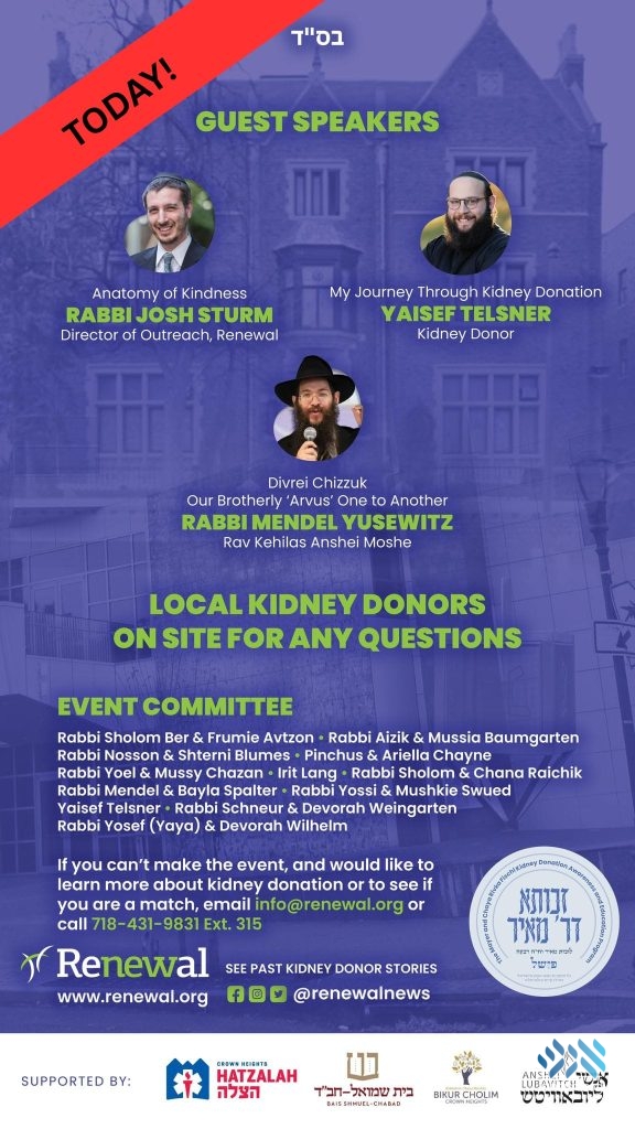 A kidney donor drive will be held Tuesday night in Crown Heights, including talks by Rabbi Josh Sturm, Director of Outreach at Renewal, and Yaisef Telsner, a Lubavitcher kidney donor sharing his personal journey.