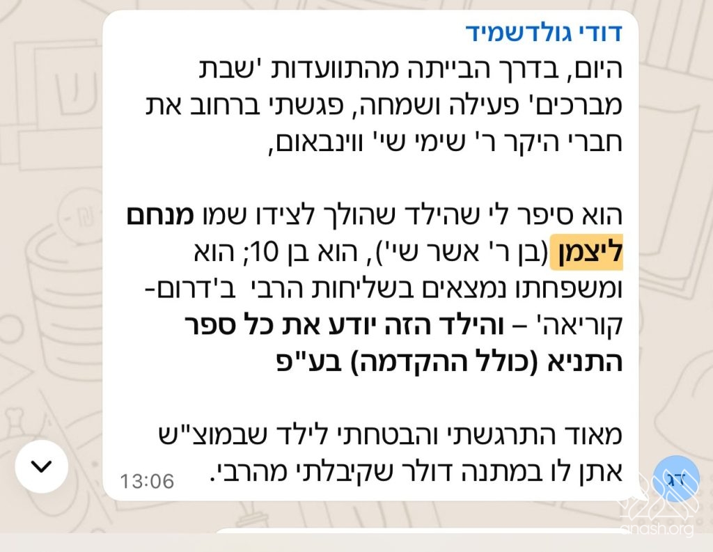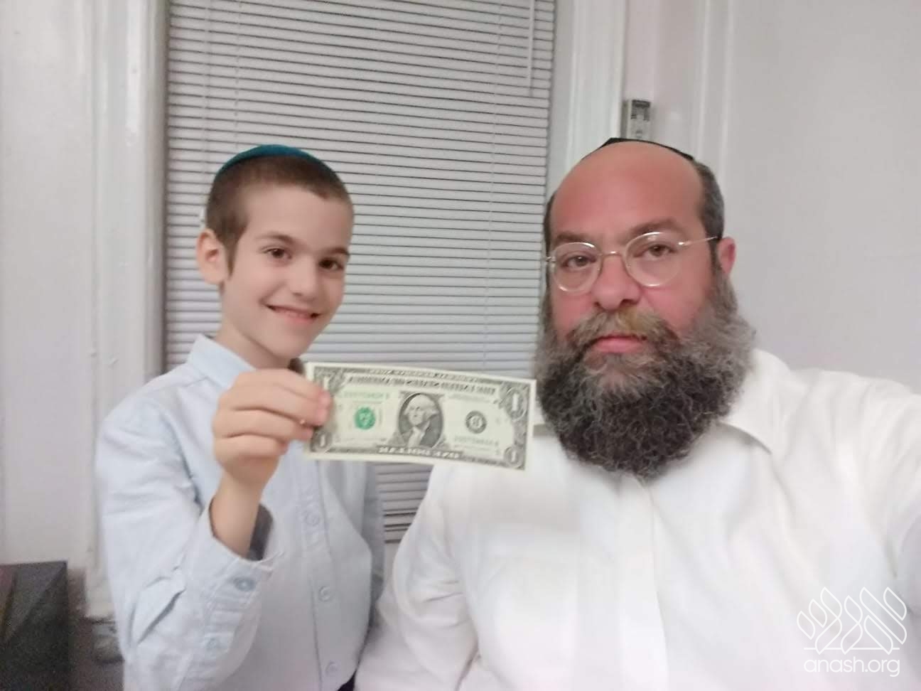 “On the way home from a shturemdike and lively Shabbos Mevorchim farbrengen, I met my good friend Reb Shimmy Weinbaum. He told me that the boy walking next to him is ten years old, his name is Menachem Litzman, the son of Reb Asher, and he and his family are shluchim to South Korea. The boy knows the entire Sefer HaTanya, including the hakdama, by heart. I was extremely moved, and I told him that on Motzei Shabbos he should come to my house, and I’ll give him a dollar I received from the Rebbe.”