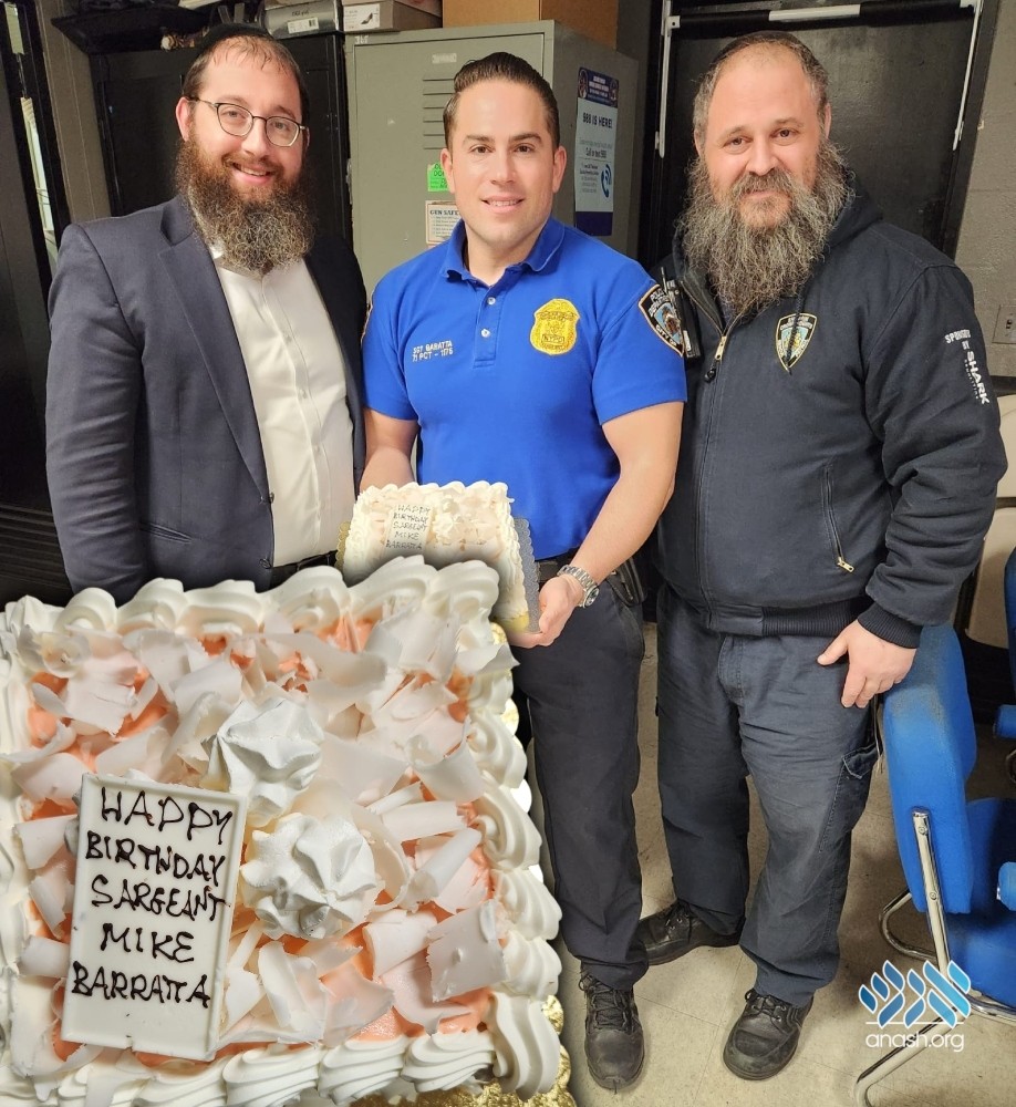 Rabbis Gadi and Mendy Hershkop of the Crown Heights Shomrim surprised NYPD Sergeant Mike Baratta with a cake for his birthday on Monday.