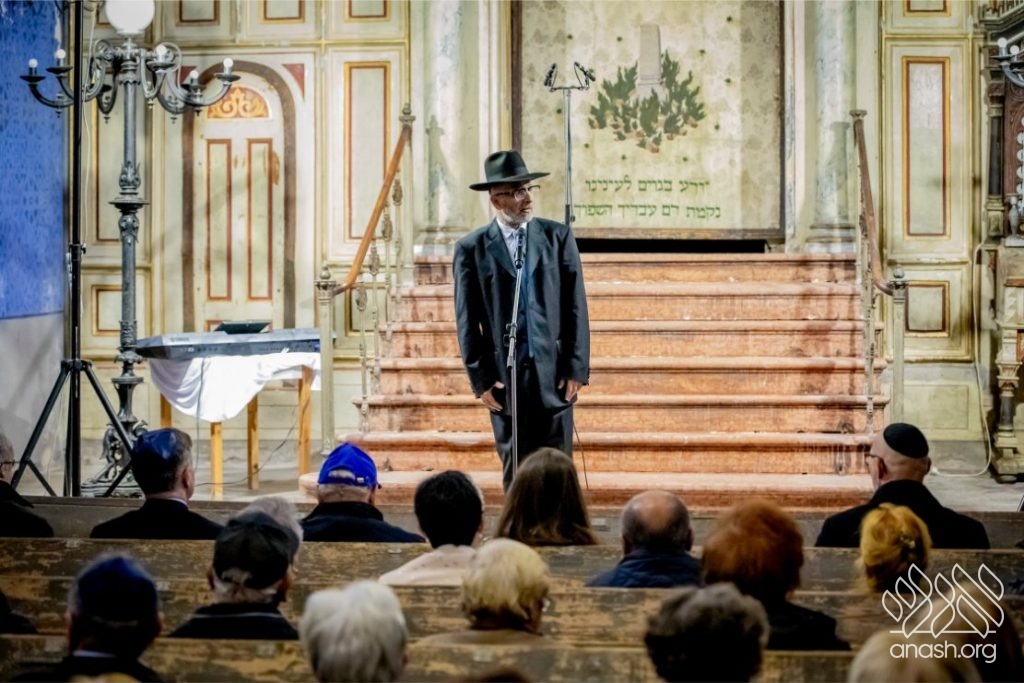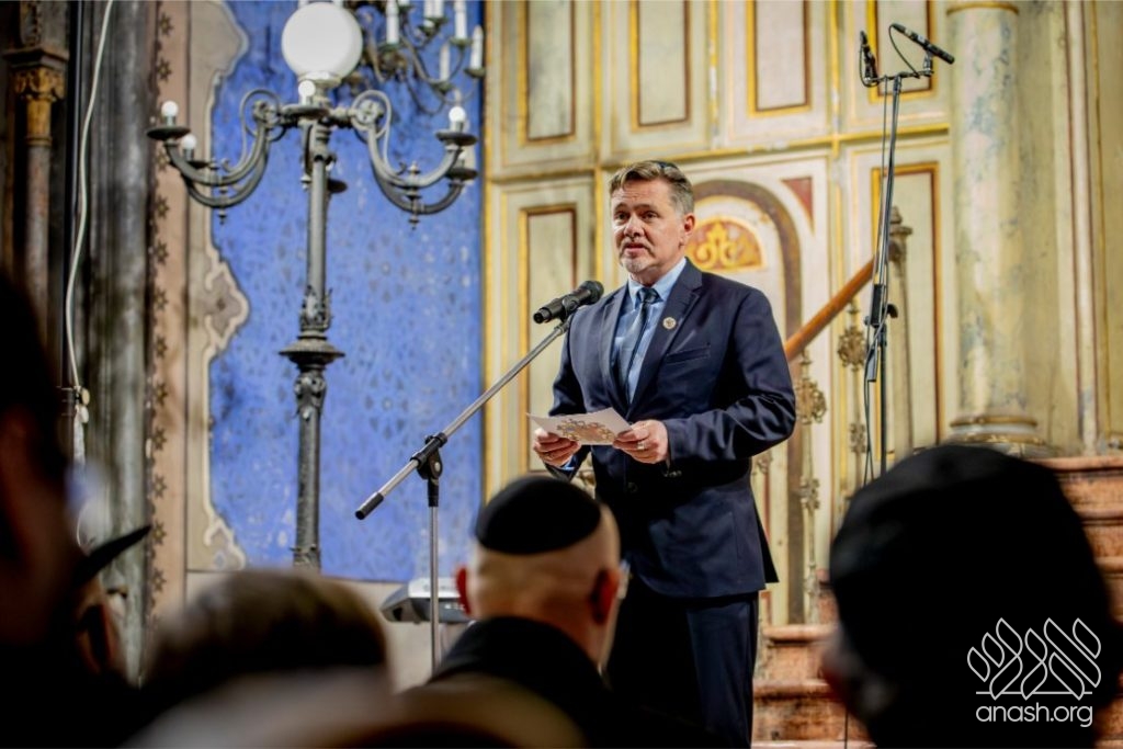 Rabbi Avraham Braun, the Rebbe’s shliach and chief rabbi of Miskolc, reflected on the city’s recent revival of Jewish life. “In the past year alone,” he said, “Miskolc has merited three historic milestones: the dedication of a new mikvah, the opening of the permanent Chabad House building, and now the rededication of this magnificent and historic synagogue.”