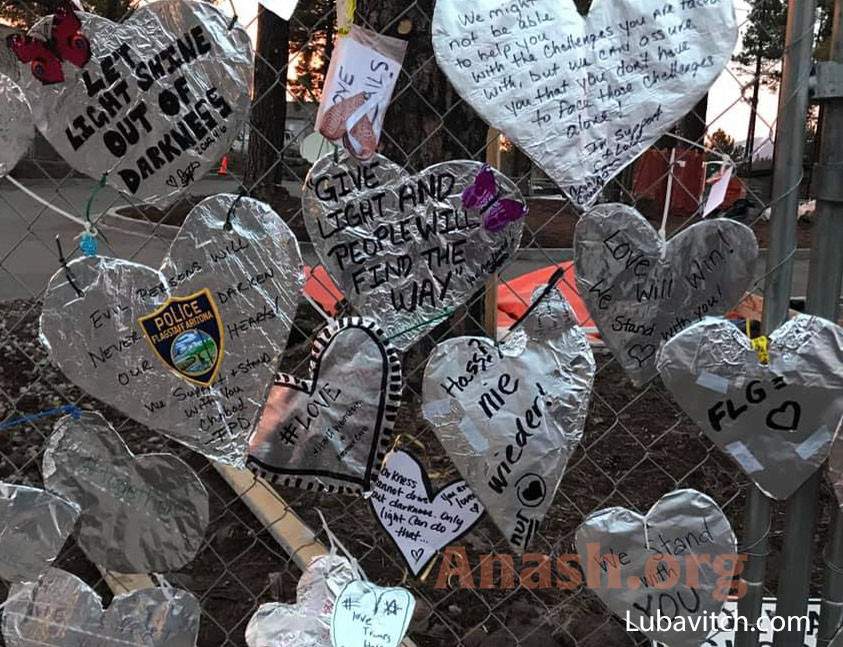 In an expression of unity, more than 150 people of all faiths and backgrounds, including the mayor, full city council of Flagstaff, and the County Supervisor, celebrated Shabbat dinner together at Chabad’s current center, down the street from the site of the new center. The rabbi invited everyone at the dinner to the grand opening of the new center, where he plans to display the foil hearts as a lasting tribute to the caring community of Flagstaff.