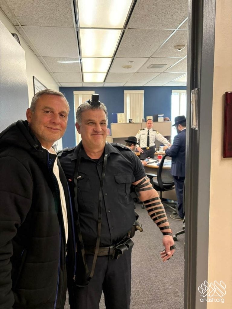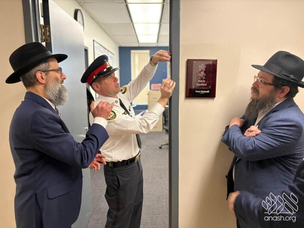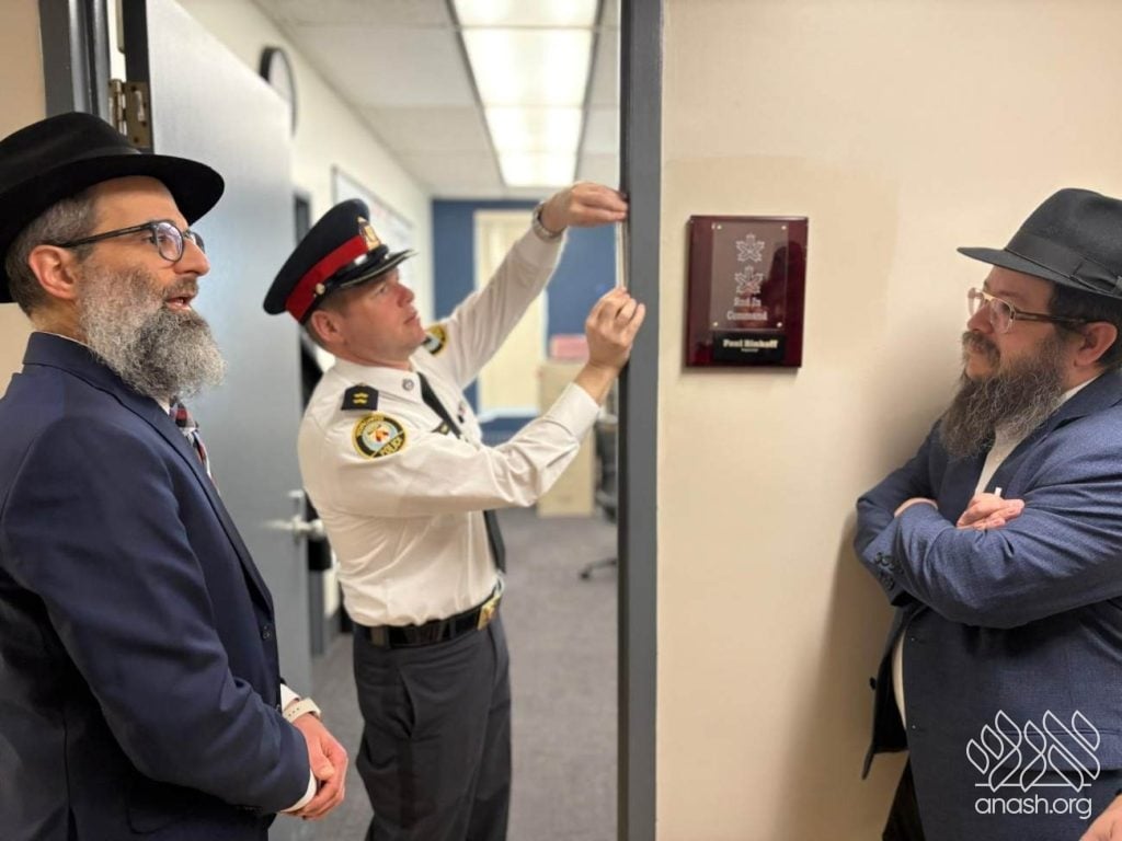 Together with Rabbi Cohen and fellow shluchim Rabbi Moshe Steiner, Rabbi Sholom Lezell, and Avi Azuelos, the inspector put up a new mezuzah on his office door. He recited the bracha himself, as many officers from the division – both Jewish and non-Jewish – came down to watch and take part.