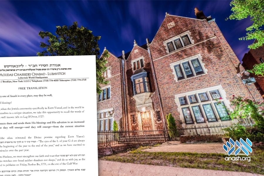 The letter begins, “When the Jewish community, specifically in Eretz Yisroel, and in the world in general, find themselves in a unique situation, we take this opportunity to recall the words of the Rebbe in his well-known talk on Lag B’Omer, 5727: