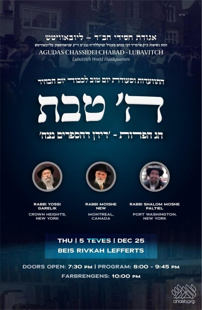 In honor of the auspicious day of Hei Teves, celebrating the redemption of the seforim – ‘Didan DehaSeforim Notzach,’ Agudas Chassidei Chabad-Lubavitch will be holding a Seudas Yom Tov and Farbrengen this Thursday, 5 Teves, at Beis Rivka Lefferts.