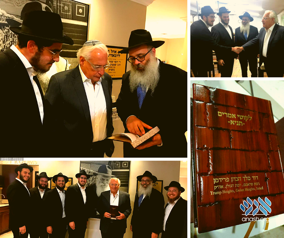 A group of bochurim who printed a new Tanya in Ramat Trump last month were given the opportunity to present a leather-bound copy to the Ambassador. He was very excited to receive it, and to study a few lines from the Sh’ar Blatt together with the bochurim.