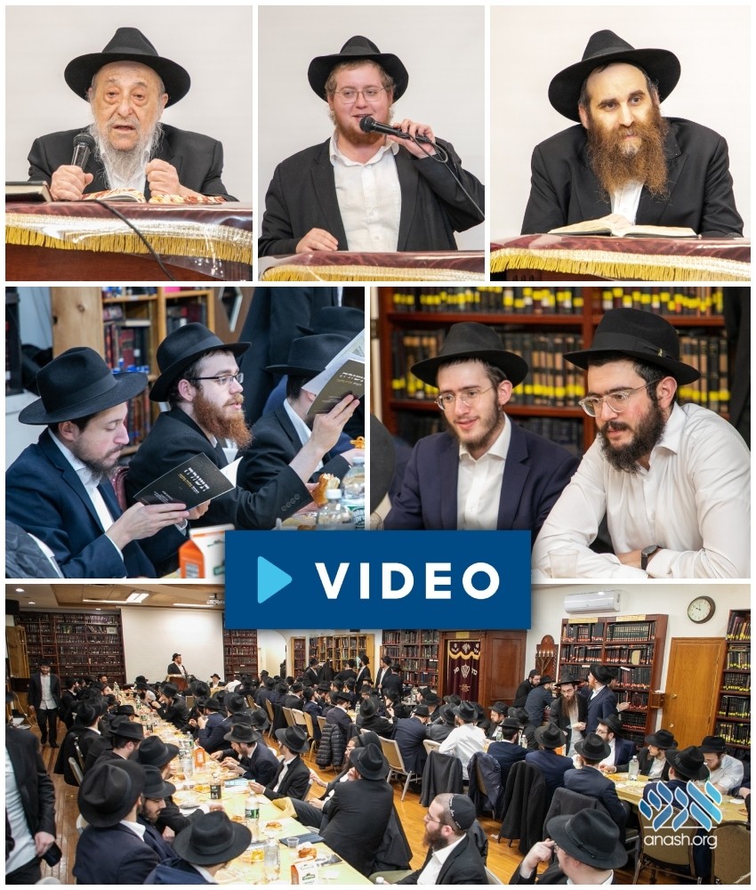 Addressing the farbrengen was guest speaker Rabbi Yitzchak Meir Gurary, mashpia at Yeshivas Tomchei Temimim Montreal, and Rabbi Yisroel Noach Raichik, maishiv in 770. Hatomim Mendel Gerlitzky spoke about Ois Bsefer Torah.