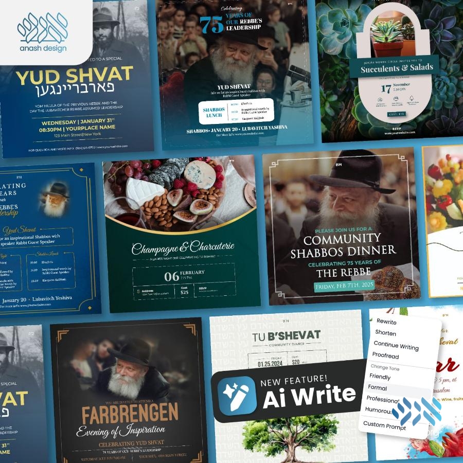 Anash Design has thousands of Chassidishe templates ready for you to customize – farbrengens, simchas, fundraisers and more with hundreds free!