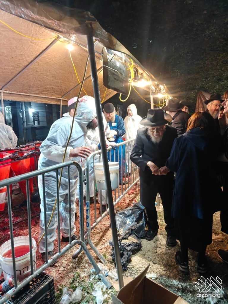 Crown Heights rov, Harav Avorhom Osdoba, does kisui hadam after kaporos shechita on Eastern Parkway by shochet Rabbi Eliyahu Ezagui.