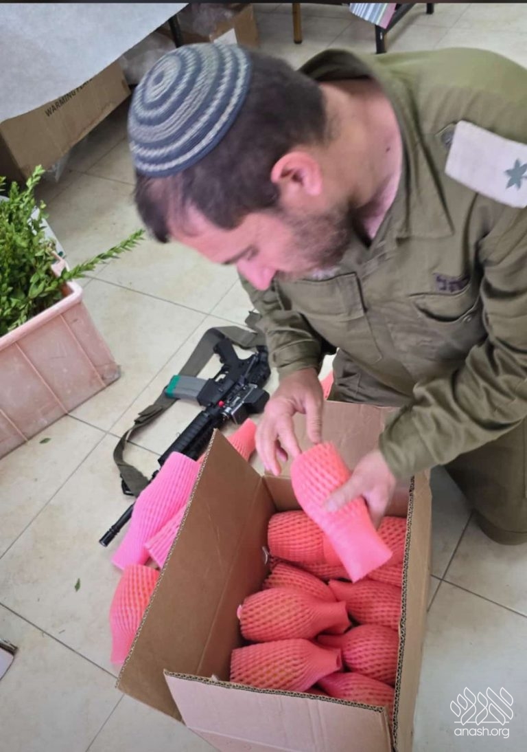Soldiers seen picking out dozens of sets of daled minim at Chabad of Tefen, to be sent to IDF troops serving in Syria over Sukkos.