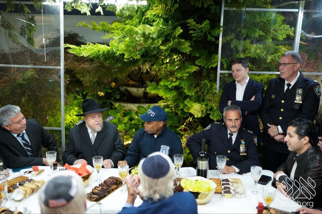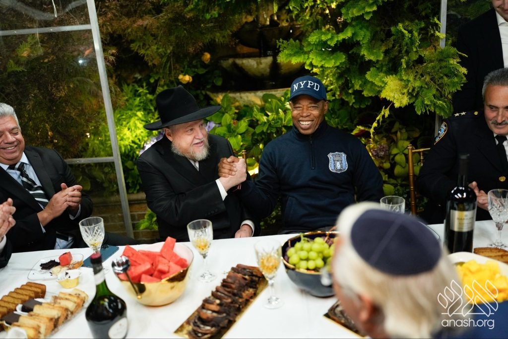 First stop off the plane tonight from the country of Albania, NYC Mayor Eric Adams joined Chabad activist Chanina Sperlin in his Crown Heights sukkah.