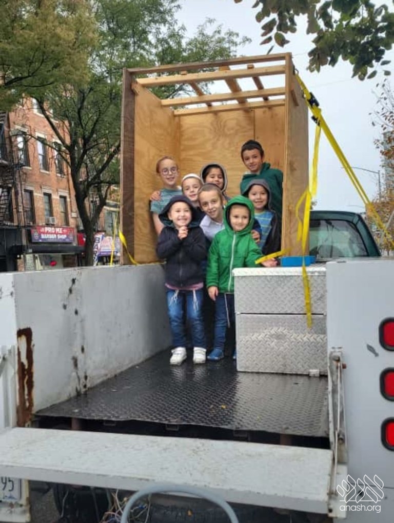 Boys from the Anash community in Brownsville went out on Mivtzoim with a sukkah mobile they built themselves.