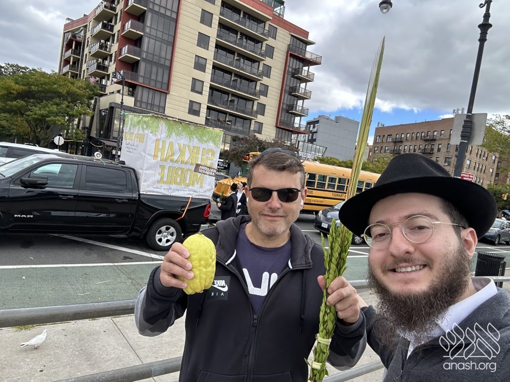 Hundreds of Yidden in Sheepshead Bay, Brooklyn, shook lulav and esrog thanks to a Sukkah Mobile run by Rabbi Avremi Reinetz.
