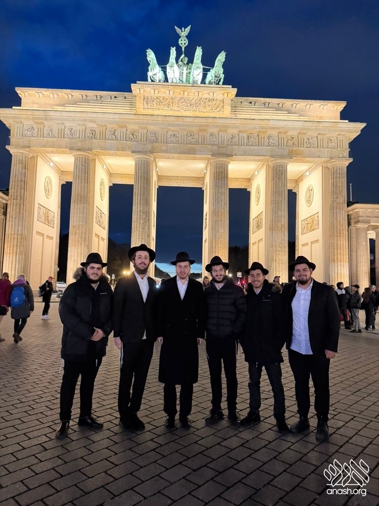 “Mach Berlin Lubavitch”: Talmidim Hashluchim to Berlin pose with shliach Rabbi Mendel Brandwine at the Brandenburg Gate in Berlin.