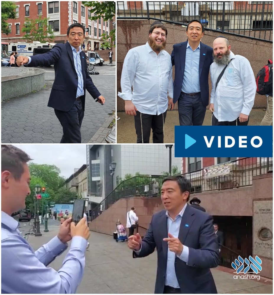 Arriving by surprise, Yang was greeted by bochurim and residents milling around 770. During his brief visit, which lasted for approximately 20 minutes, Yang recorded a video message to his supporters, urging them to go out and vote.
