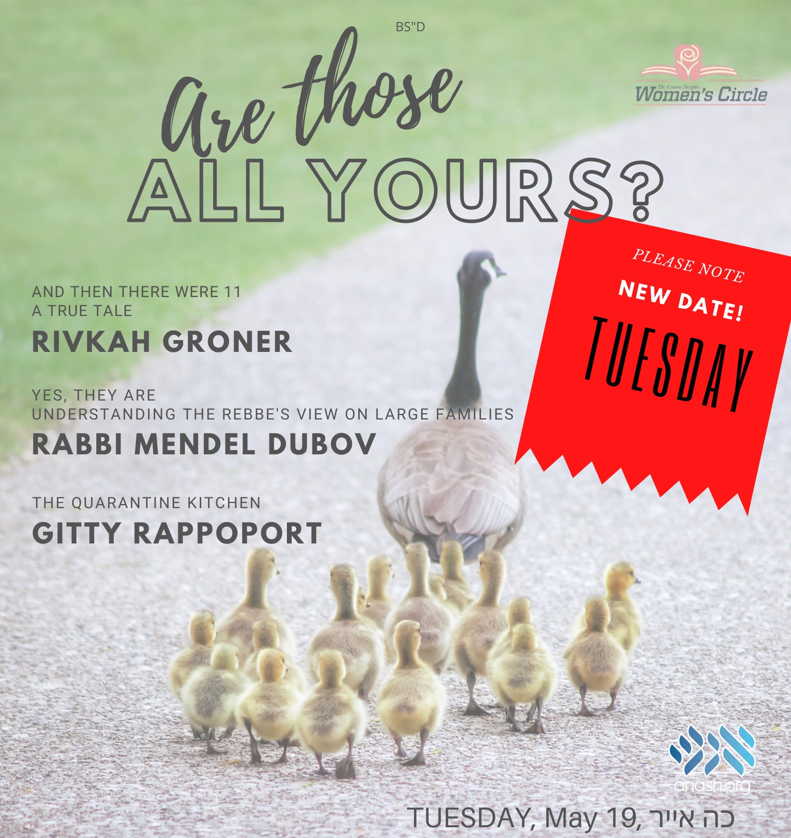 On Tuesday evening, the Crown Heights Women’s Circle will hold an online event titled ‘Are Those All Yours?’ featuring Mrs. Rivkah Groner, Rabbi Mendel Dubov, and Mrs. Gitty Rappoport.