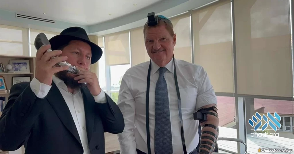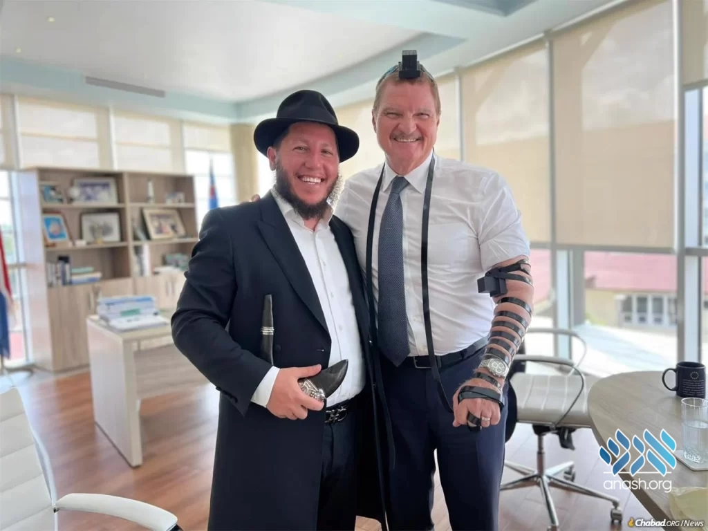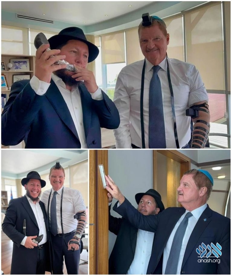 On this visit, Blasberg entered the prime minister’s office carrying a mezuzah in his pocket, a pair of tefillin in his hands, and a shofar tucked under his arm. The rabbi proceeded to blow the shofar for the prime minister, per the tradition to sound the shofar blown daily during the Jewish month of Elul, as the Jewish people around the world prepare to once again crown G‑d as King on Rosh Hashanah. Blasberg then helped Eman don tefillin, and they discussed the opportunity the High Holidays afford to reconnect with G‑d.