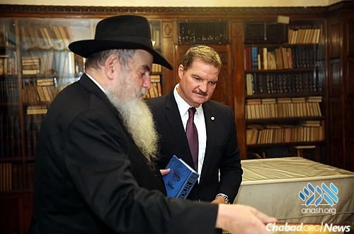 Prime Minister Mike Eman of Aruba visited Lubavitch World Headquarters in the Crown Heights neighborhood Brooklyn, N.Y., in 2015, on an offical visit. Here, he is in the Rebbe's study with Rabbi Moshe Kotlarsky, vice chairman of Merkos L’Inyonei Chinuch.